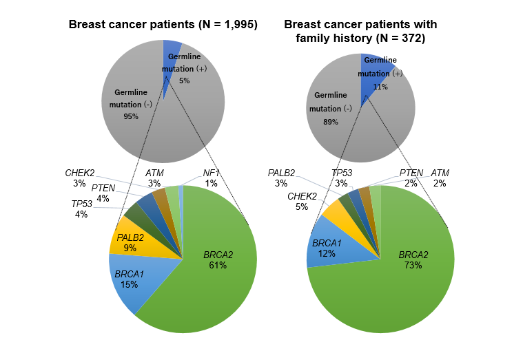 We used DNA extracted from blood cells to identify germline variants, and 11 genes implicated in hereditary breast cancer were studied by targeted-capture sequencing for 1,995 unselected Japanese women with breast cancer. Pathogenic variants were identified in 101 patients (5.1%), which included 62 BRCA2 and 15 BRCA1 mutations, which was equivalent to the previously reported frequency in the Japanese1 and Chinese cohorts2. Pathogenic variants were more frequently identified in patients with a family history of breast cancer (n = 41, 11.0%), compared with those without (n = 50, 3.4%) (P < 0.00001). Of the analyzed genes, BRCA2 was the most frequently mutated in both patients with and without a family history (see accompanying figure).