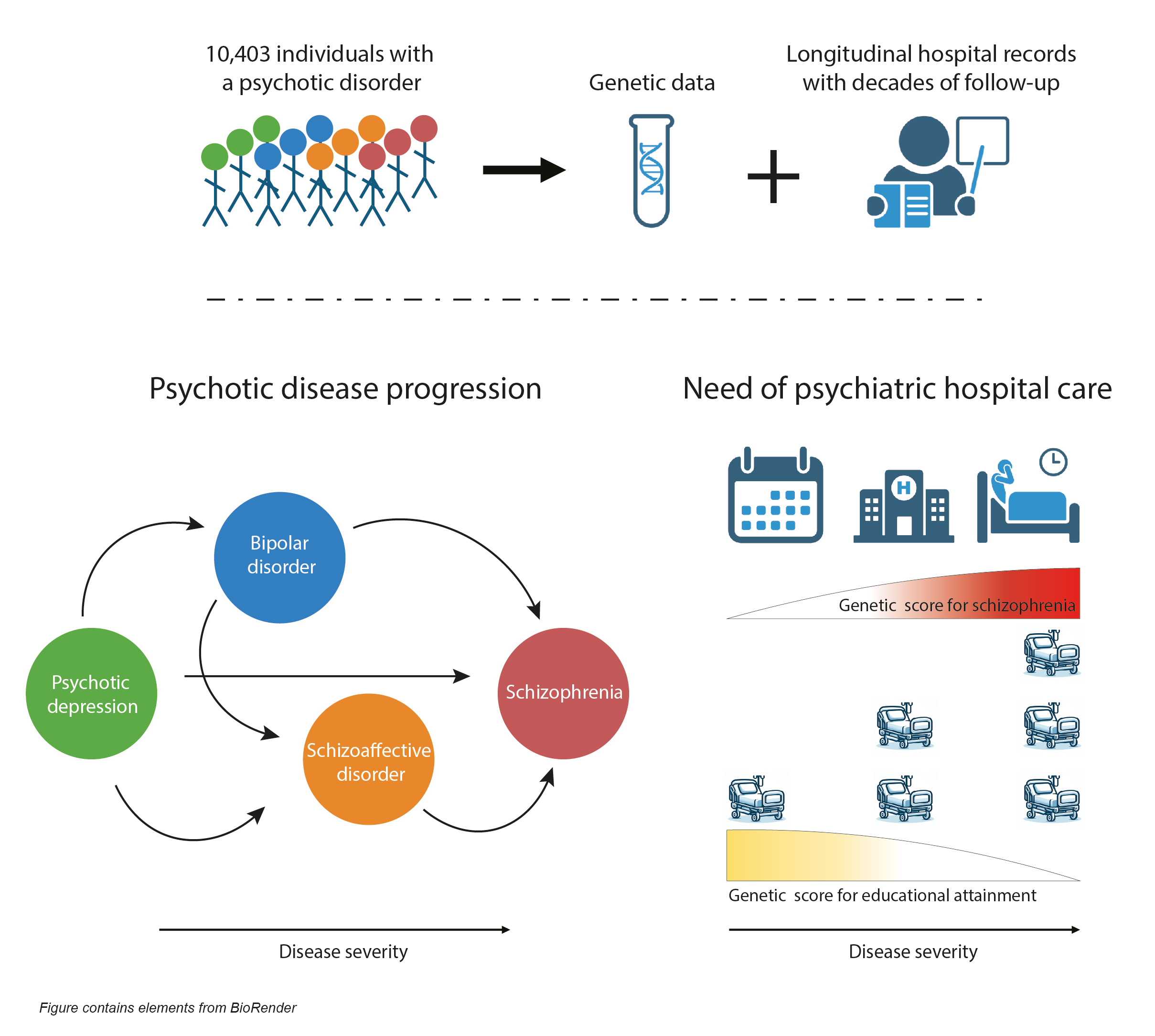 We also studied the genetic contribution to disease severity associated with schizophrenia. We found that individuals with a high genetic liability for schizophrenia had a more severe psychiatric disease trajectory, with more frequent and longer hospital visits than schizophrenia diagnosed individuals with a low genetic loading. The genetic make-up associated with a low educational attainment also impacted the psychotic disease-course, but independently from the genetic loading associated with schizophrenia, suggesting two separate underlying mechanisms. The genetic profile for low educational attainment resulted in a distinctly increased need for psychiatric hospital care. While study participants with a high genetic liability for schizophrenia had long individual hospital visits, the participants with a low genetic loading for educational attainment had short and more frequent visits – a hospitalization profile often known as a “revolving door” phenomenon. This revolving door pattern was strongly associated with substance use, which acted as a mediator of the observed genetic effect. A low genetic score for educational attainment had a very strong impact on the risk of having been diagnosed with a substance use disorder, while the genetic score for schizophrenia were uncorrelated with substance use disorder. Importantly, we found that having been diagnosed with a substance use disorder was not just a marker for a poor outcome, but that the diagnosis for substance use disorder preceded an increase in psychiatric hospitalizations even when it was given years after the initial psychotic disorder diagnosis – making it an attractive target for prevention. We also validated these results in a non-psychiatric population in the large Finnish biobank study FinnGen.