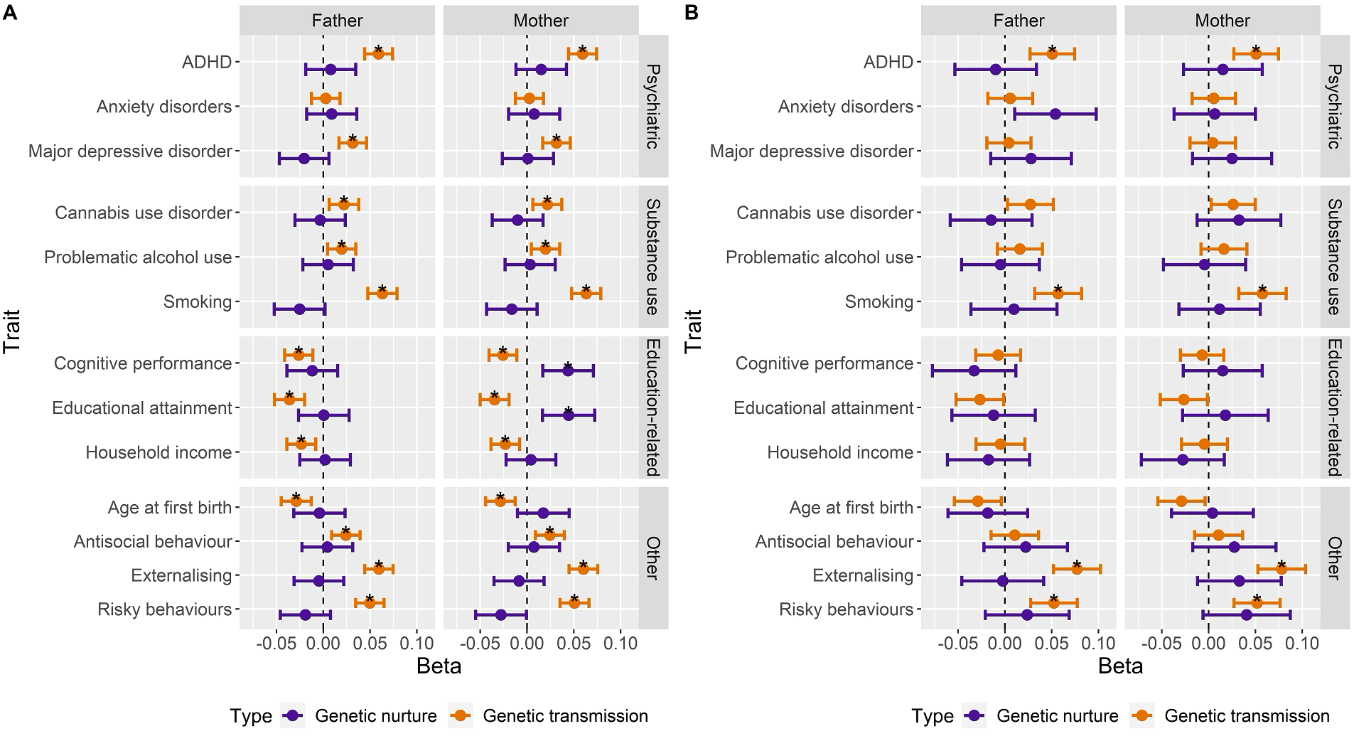 Fig. 2. Genetic transmission and genetic nurture effects (standardised regression coefficients) at ages 8 (A) and 14 years (B), using the 13 different polygenic scores.