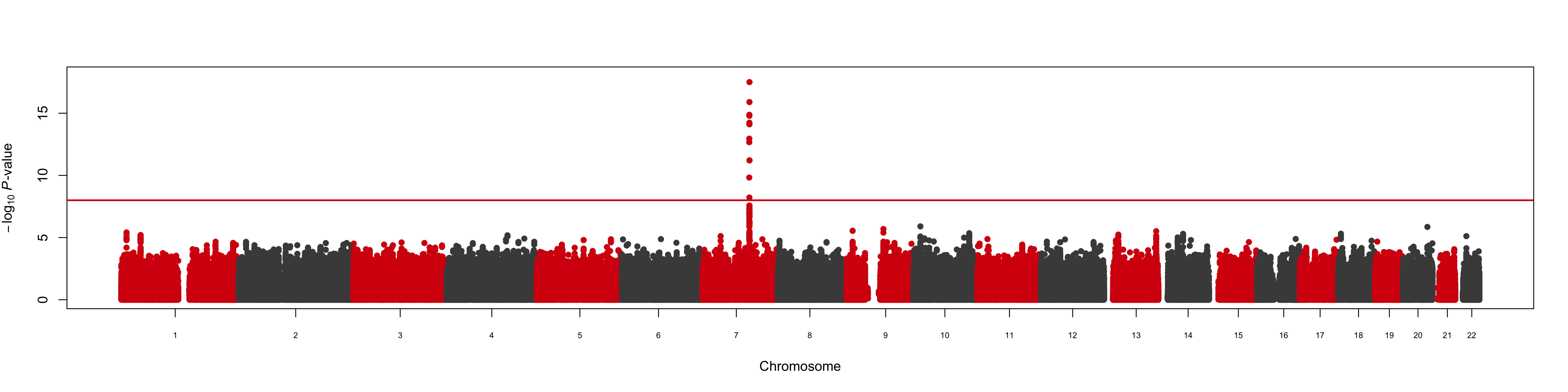 We found that the CYP3A7*1C allele dominates the genetic architecture of hormone levels in premenopausal women. The CYP3A7 locus on chromosome 7 was the only highly significant association (figure shows a Manhattan plot of single nucleotide polymorphism (SNP) associations with luteal phase urinary oestrone-3-glucuronide levels); the rare allele (European minor allele frequency = 0.04) was associated with a 49.2% reduction in oestrone-3-glucuronide and explained 11.5% of the variation in levels. In a subset of women for whom we were able to measure progesterone, this allele was also associated with significantly lower levels.