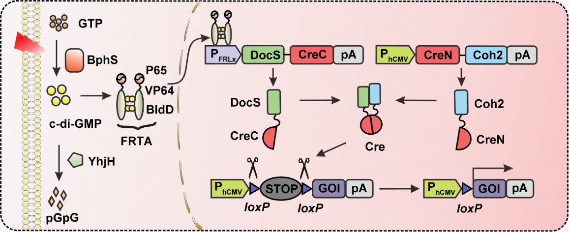 Recently, we further constructed an FRL-induced split-Cre-loxP system (FISC) as a site-specific genetic manipulation tool to control DNA recombination precisely and efficiently5. By contrast, chemical- and UV light-inducible Cre-loxP systems only achieved temporal control of genome engineering and stirred up inconvenient cytotoxicity. In FISC, Cre recombinase was split into two fragments. The N-terminal Cre fragment was fused to a Coh2 domain, allowing the constitutive expression of the CreN-Coh2 fusion protein. On the other hand, the C-terminal Cre fragment was fused to a DocS domain. The expression of DocS-CreC fusion protein can be driven by the FRL-responsive promoter under FRL illumination. Consequently, Cre recombinase can be functionally restored via the heterodimerization of two fusion proteins (Fig. 1).