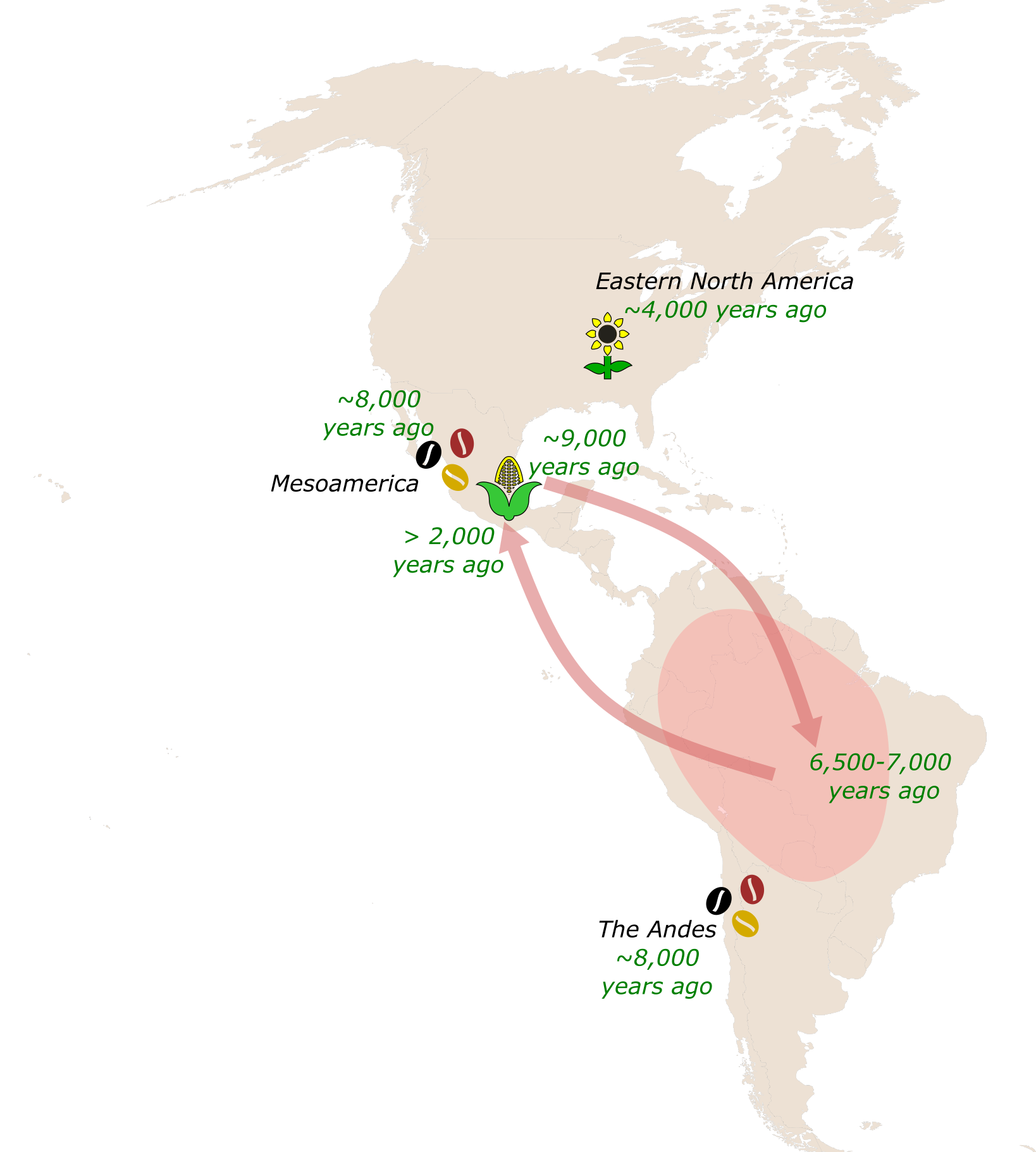 Maize, common bean, and sunflower first became food crops across three separate centers of domestication in the Americas, which collectively saw the domestication of many more crops as well as a few animals. Over millennia, these centers – and possibly others in South America – came to be connected through networks of human movement and exchange. This is perhaps best demonstrated in maize’s travels through Central and South America, eventually making it to eastern North America, adapting to the temperate climate, and largely replacing Indigenous crops there.