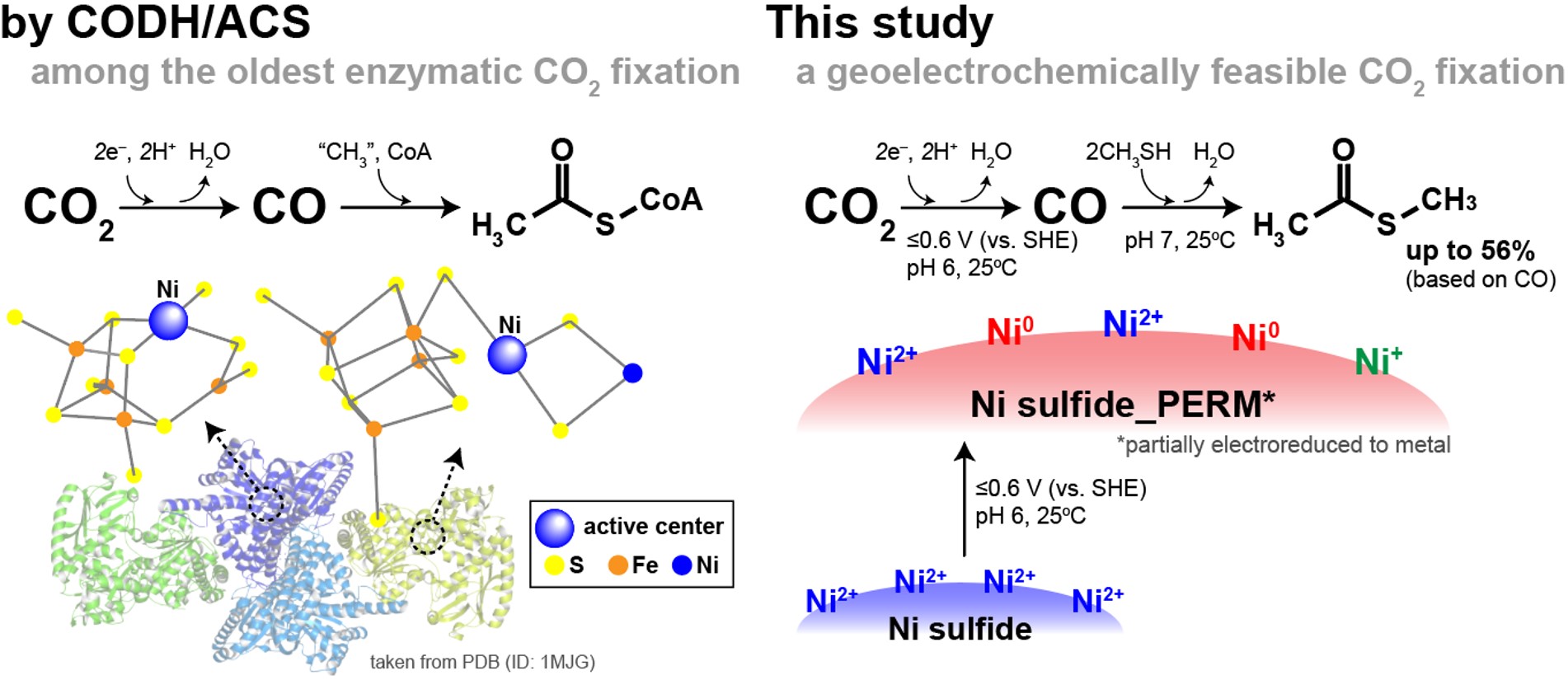 In the present study, we demonstrate NiS-to-Ni0 electroreduction under a simulated geoelectrochemical condition in primordial ocean hydrothermal systems (–0.6 to –1.0 V versus the standard hydrogen electrode). The resultant NiS-Ni0 assemblage, that is, NiS_PERM, realizes MTA formation from CO and methanethiol even at room temperature and neutral pH. NiS_PERM accumulates surface-bound CO during the formation under CO2 atmosphere, so NiS offers a two-step CO2 fixation route to thioester with the aid of electric energy (Fig. 1 right). Sustained occurrence of electrochemical energy adequate for the NiS_PERM formation and the subsequent reactions is limited in nature except for deep-sea hydrothermal settings. This environmental specificity, together with the ubiquity of CODH/ACS in hydrothermal vent chemolithotrophic communities, suggests that the NiS_PERM-promoted thioester synthesis in primordial ocean hydrothermal systems was a crucial initial step toward the autotrophic origin of life.