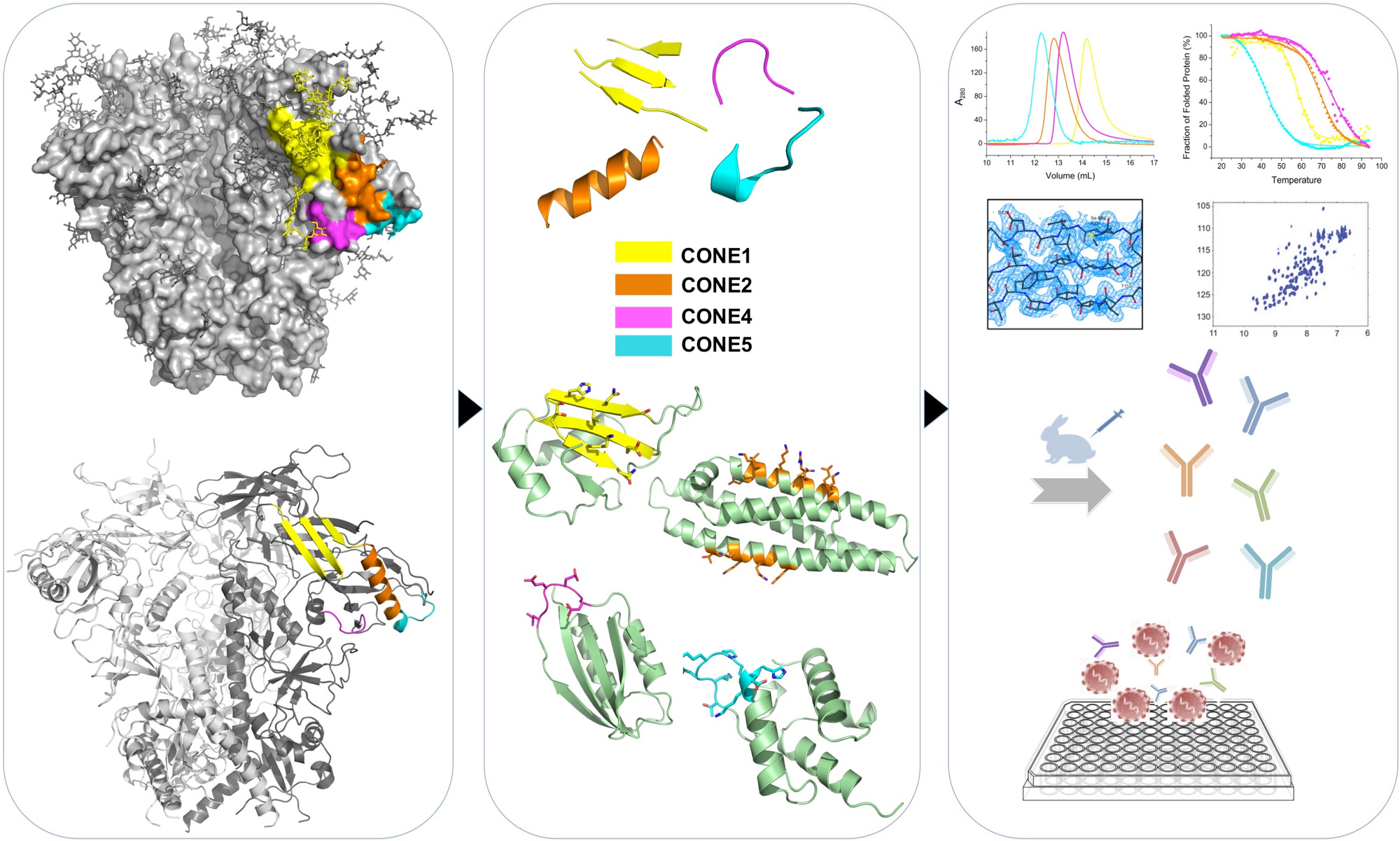 Our immunization strategy was designed so that we could compare immunogens of different sequence conservation and different structural stabilities, providing valuable insights for vaccine design: (a) Immunization with nanoparticles may elicit antisera with higher specificity; (b) CONE immunogen of metastable protein scaffolds may induce antibodies with elevated non-specificity (CONE 5 vs. CONE 1/4); and (c) Sequence conservation is an important criterion of immunogenicity of CONEs (CONE 2 vs. CONE 1/4).