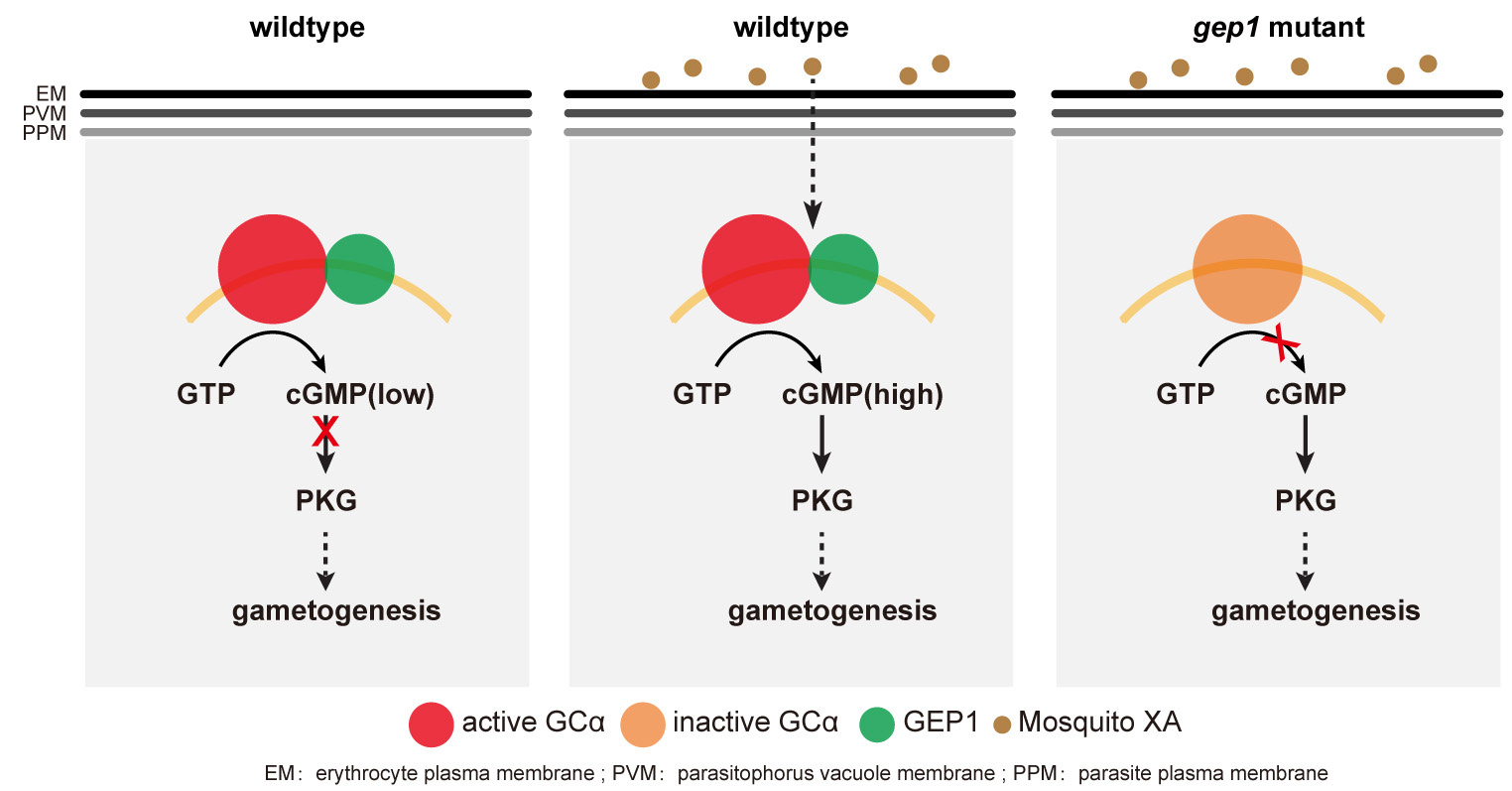 Fortunately, one gene encoding an amino acid transporter-like protein (termed GEP1) stood out. GEP1 is a Plasmodium-specific protein with 14 predicted transmembrane domains. The ∆gep1 parasites develop viable and morphological normal male and female gametocytes, but fail to produce male and female gametes. The ∆gep1 gametocytes display defect at all PKG-downstream signal and cellular events during gametogenesis. Importantly, compared to the elevation of cGMP in wildtype gametocytes, the ∆gep1 gametocytes failed to increase cGMP in response to XA stimulation. GEP1 seems to function upstream of cGMP-PKG in XA-stimulated signaling, fitting our initial expectation of GEP1 as a sensor of XA.