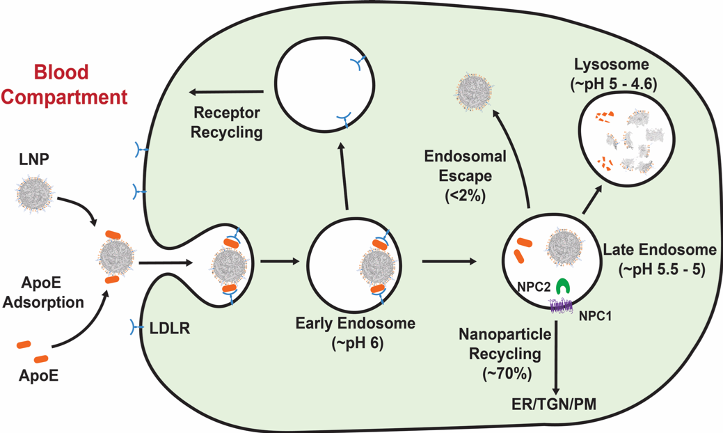 My lab, in part, specializes in researching the enigma surrounding the intracellular fate of lipid-based nanoparticles (LNPs) used for the delivery of messenger RNA (mRNA). LNPs are potent carriers and have been approved by the FDA for the delivery of small interfering RNA (siRNA) to treat amyloidosis. However, their ability to deliver cargo to target sites within the cytosol remains low. Almost all nanoparticles are sequestered in the endosomal compartments or recycled from the cell. We had previously discovered that a cholesterol transporter is responsible for the efflux of LNPs. Since cholesterol is a key component within the nanoparticles, we hypothesized that through replacement of cholesterol with its derivatives, there is a possibility to restrict exodus of LNPs from the cell and provide them an ample opportunity to timely release their cargo. Nature offers a rich source of cholesterol derivatives, and we rationally selected an array of derivatives found in natural products. We discovered that a cholesterol analogue with just an additional ethyl group in the alkyl tail (at the C24 position) of cholesterol (β-sitosterol) causes a substantial increase in gene delivery. We discovered that a cholesterol analogue with just an additional ethyl group in the alkyl tail (at the C24 position) of cholesterol (β-sitosterol) causes a substantial increase in gene delivery. We found that other C24 alkyl derivatives showed improved intracellular delivery which was independent of the type of ionizable lipid used (active ingredients within LNPs) or cargo (mRNA, siRNA). Thus, began a long journey to uncover the reasons for this increase in gene transfection.