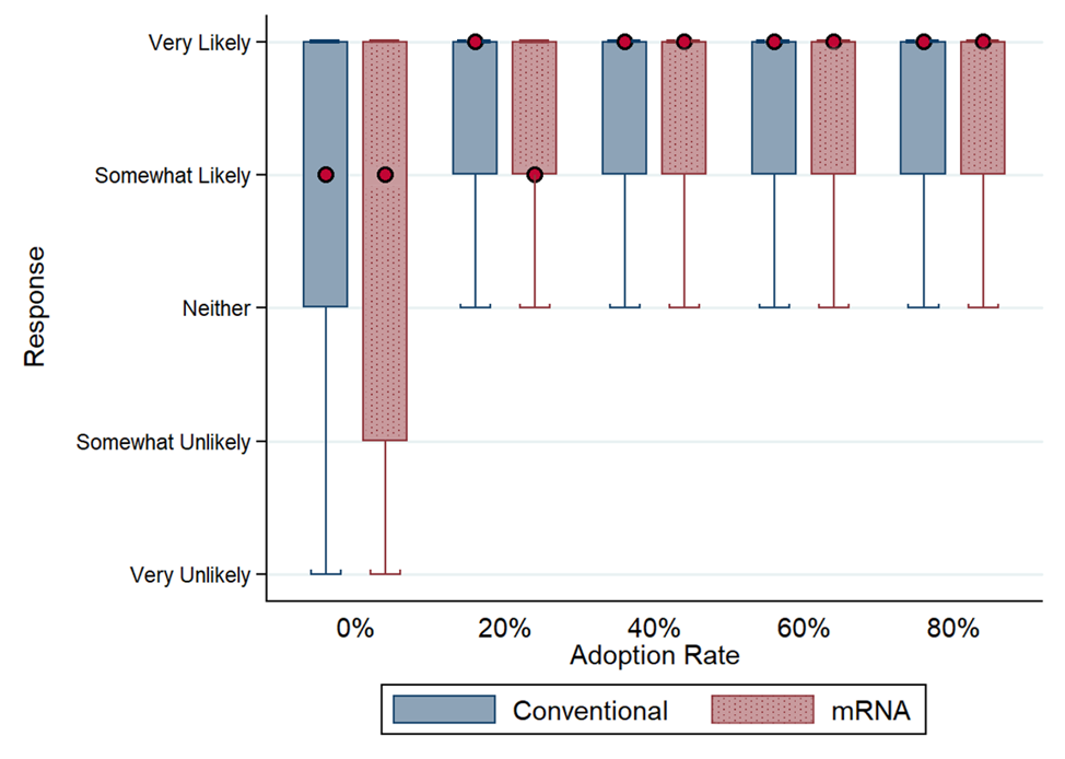 Overall, therefore, we show that the novelty of the mRNA vaccine technology reduces the odds of a higher level of vaccine acceptance by 14.2% (odds ratio 0.858; p < 0.001). On the other hand, we find that social conformity reduces vaccine hesitancy. At a 0% inoculation rate, 31.7% report that they are “very likely” to get an mRNA vaccine while at a 20% inoculation rate, willingness jumps to 49.6%.
