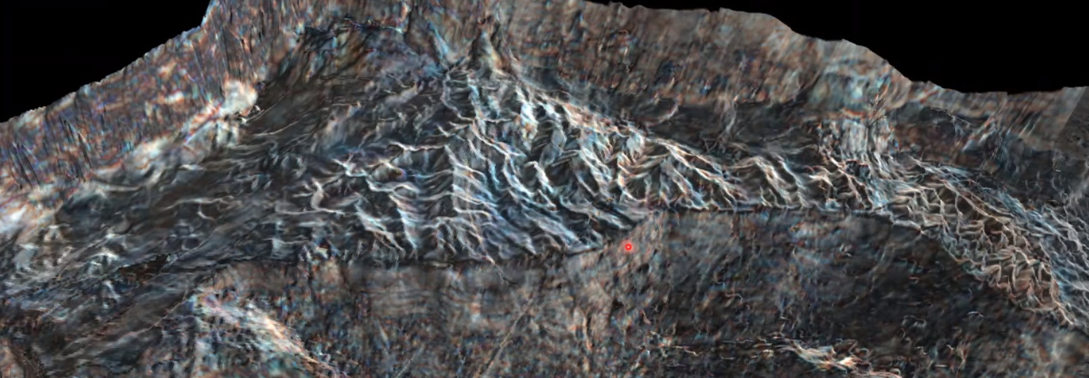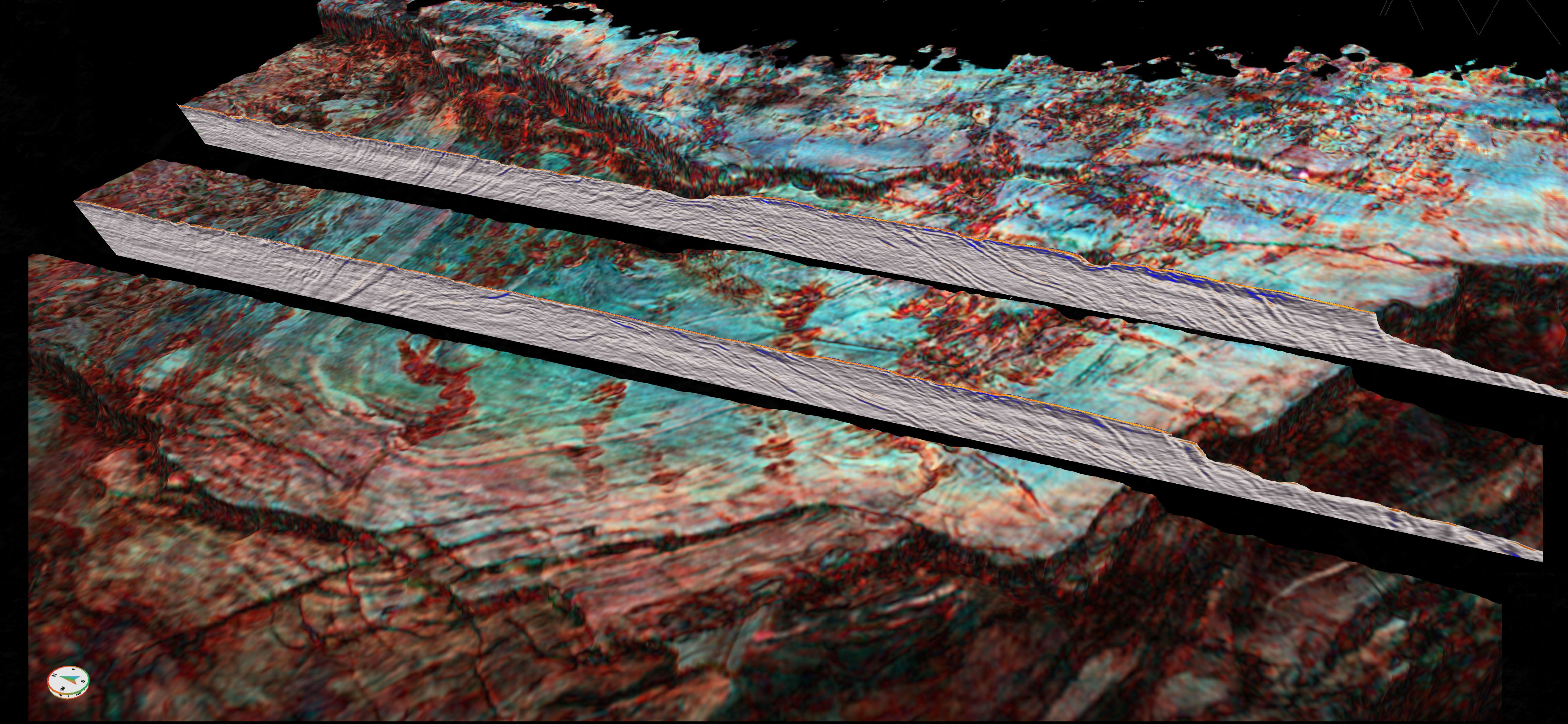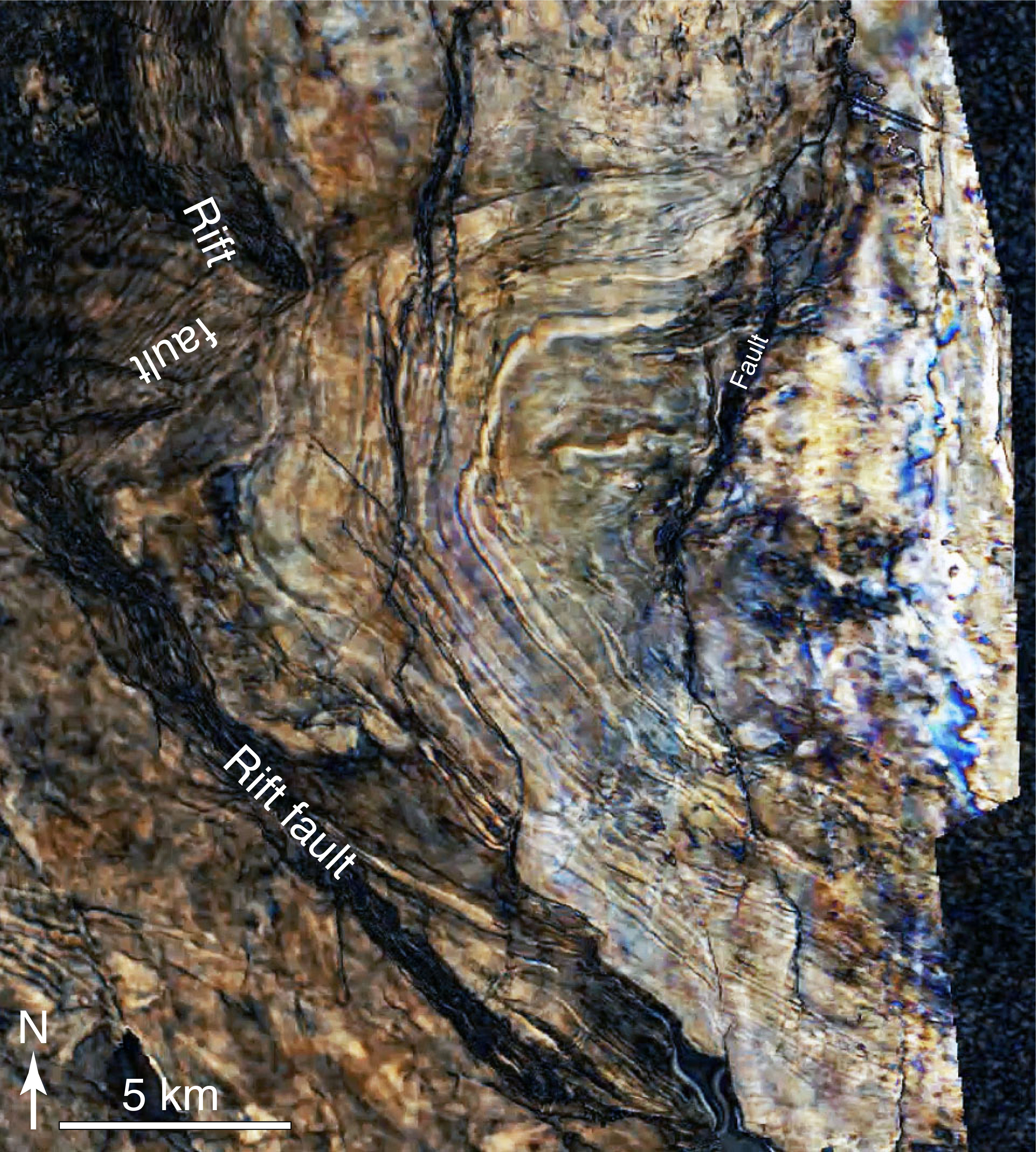 Part of the blend image shared with me by the second author that lead to collaboration and the current paper. The image shows the top of the crystalline basement below ca. 1.5 km of sediments. A folded banding is seen, very similar to that seen in sheared onshore metamorphic basement.