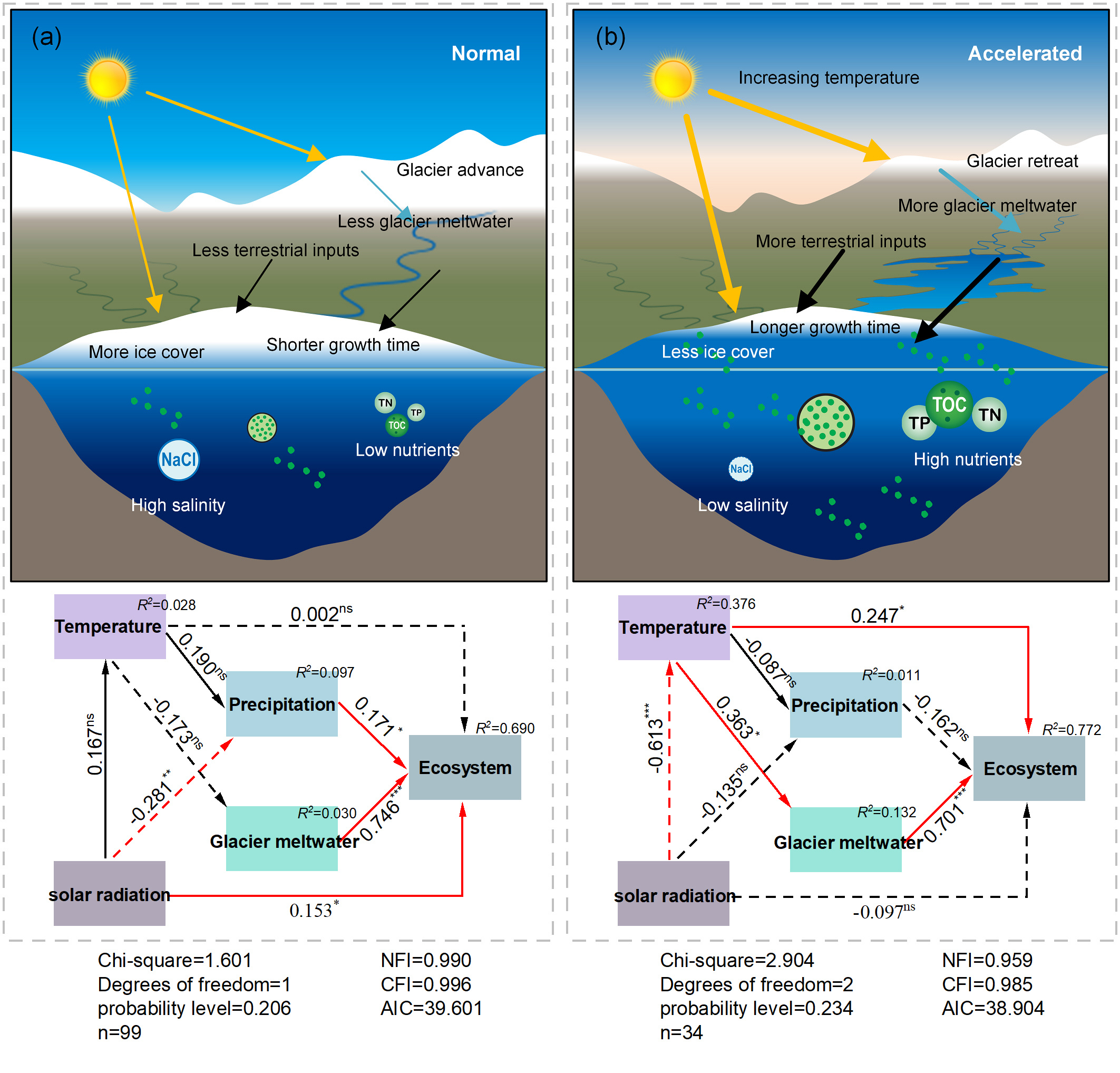Cascade effects from temperature-driven glacier ablation likely drive rapid ecosystem changes. Structural Equation Modeling (SEM) shows that besides direct warming impacts, indirect effects such as shorter ice cover, extended growing seasons, increased water temperature, decreased salinity, and enhanced terrestrial inputs collectively promote algal growth (Fig. 4). This study highlights that algal communities in Tibetan Plateau glacial lakes rapidly track climate warming, providing critical evidence for understanding high-elevation lake ecosystem responses to global change. It urges the implementation of targeted strategies to alleviate ecological imbalance.