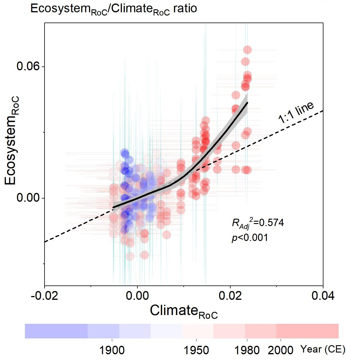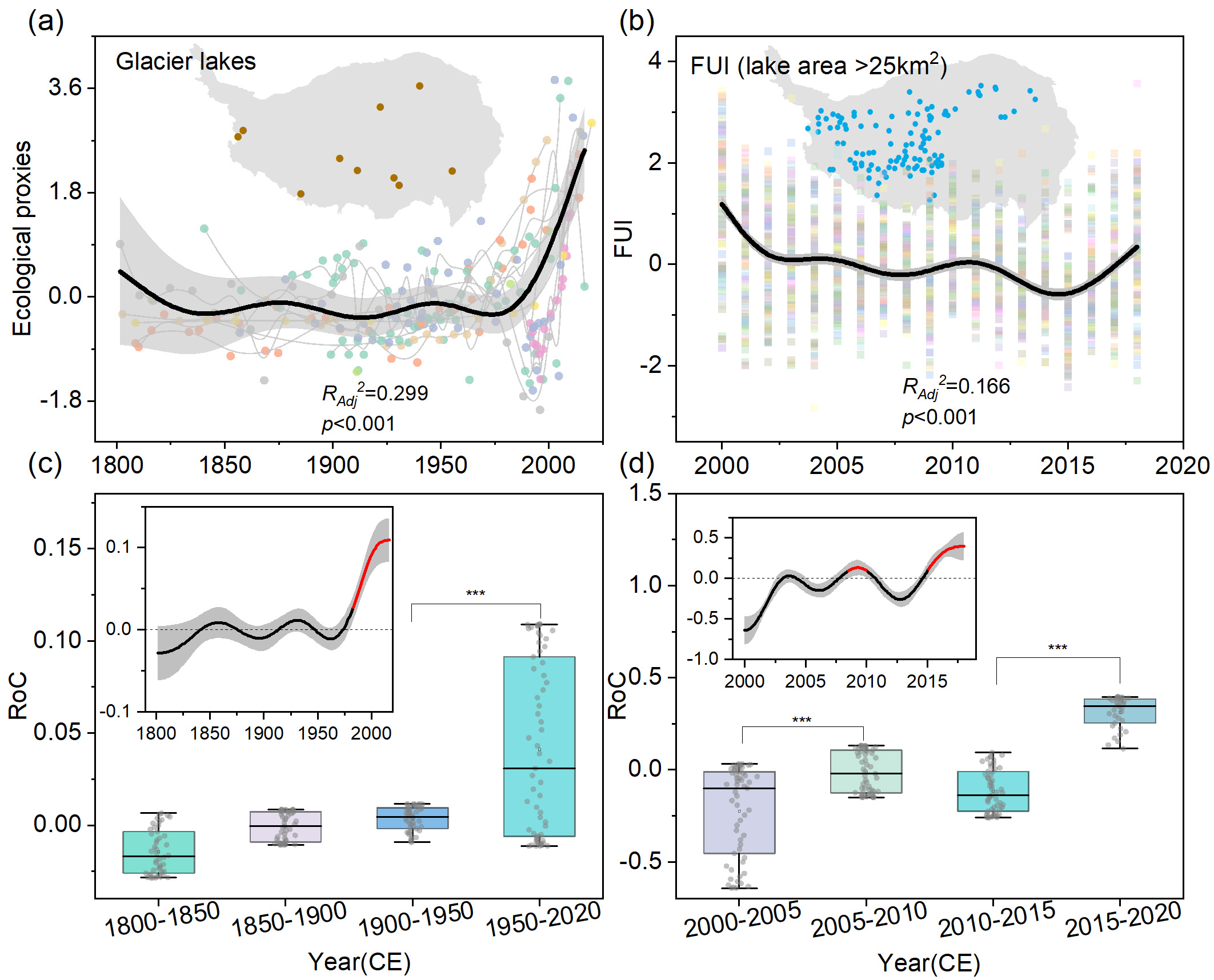 Focusing on the period post-1850s marked by anthropogenic warming, we calculated ecological and climatic rates of change (RoC) using Generalized Additive Models (GAM) and compared their rates. Ecological RoC accelerated after 1960s, initially aligning with climatic RoC. However, the 1:1 modeling revealed a significant deflection after 1980s: ecological RoC surpassed climatic RoC, disrupting the long-term eco-climate dynamic equilibrium in glacial lakes, a finding supported by GAM results (Fig. 2). Regionally, most Tibetan glacial lakes showed similar ecological RoC acceleration since the 1980s (Fig. 3).