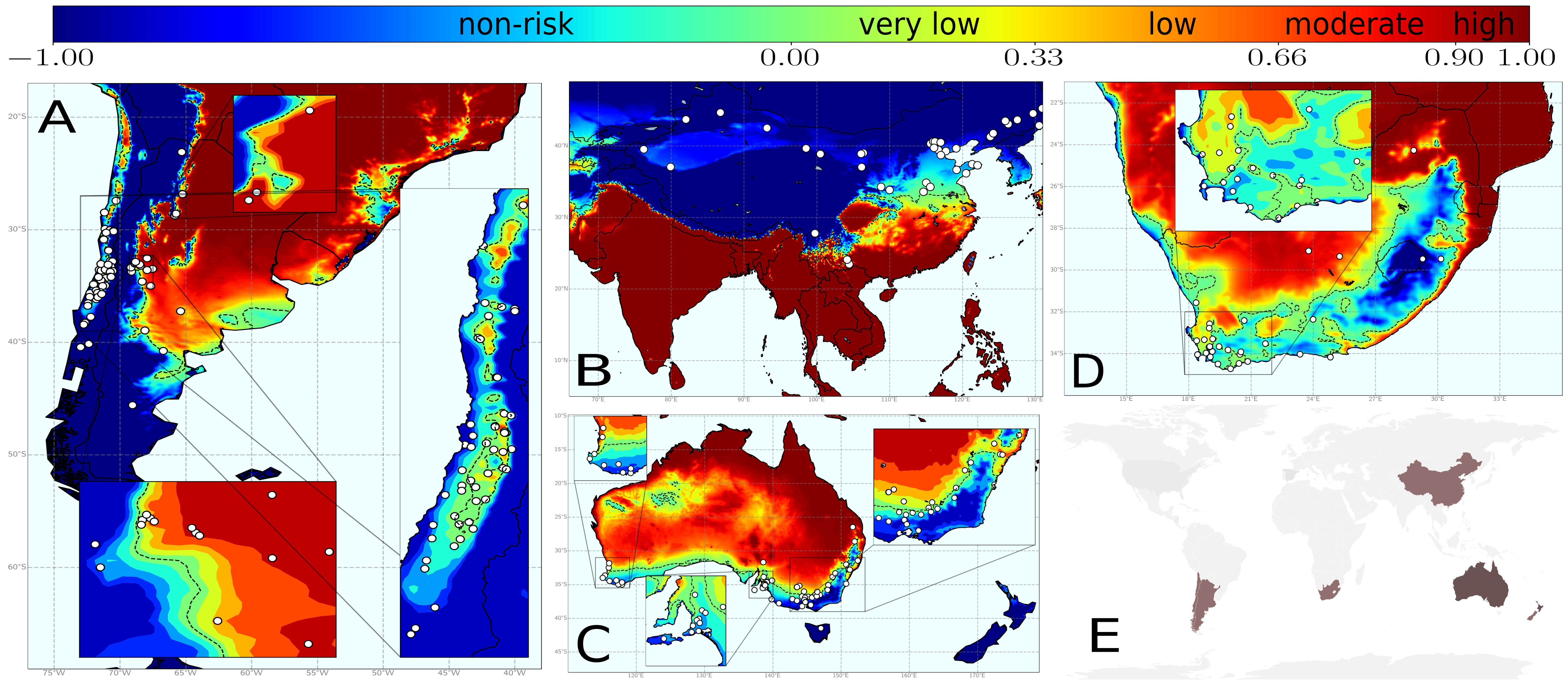 Finally, we had all the pieces to develop our complete model on PD risk. Information on the vector abundance allow us to know how many new infected plants will an infected plant contribute to infect, while temperature data allow us to know how many of these new infections will indeed thrive. So only if this balance is positive, an outbreak will occur. Nevertheless, information on vector abundance was not available for all wine-producing zones worldwide. In such cases, we selected a reasonable transmission scenario as a homogeneous baseline, i.e. the same mean value of the vector abundance is used everywhere (Fig 2).