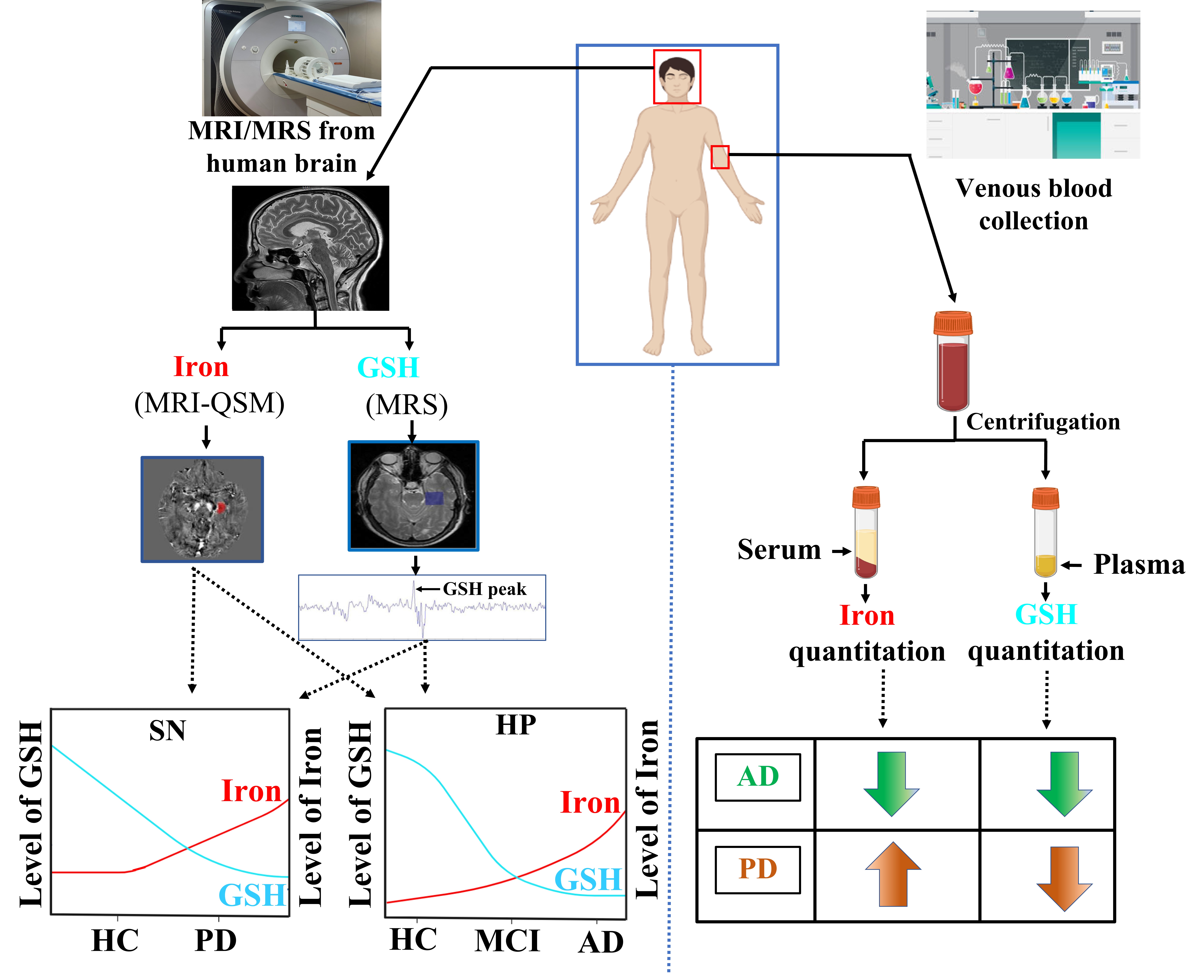 A schematic representation of the workflow of GSH and iron quantitation from brain and blood. Based on literature review of AD and PD patients' studies, GSH and iron levels in brain and plasma and serum is represented.