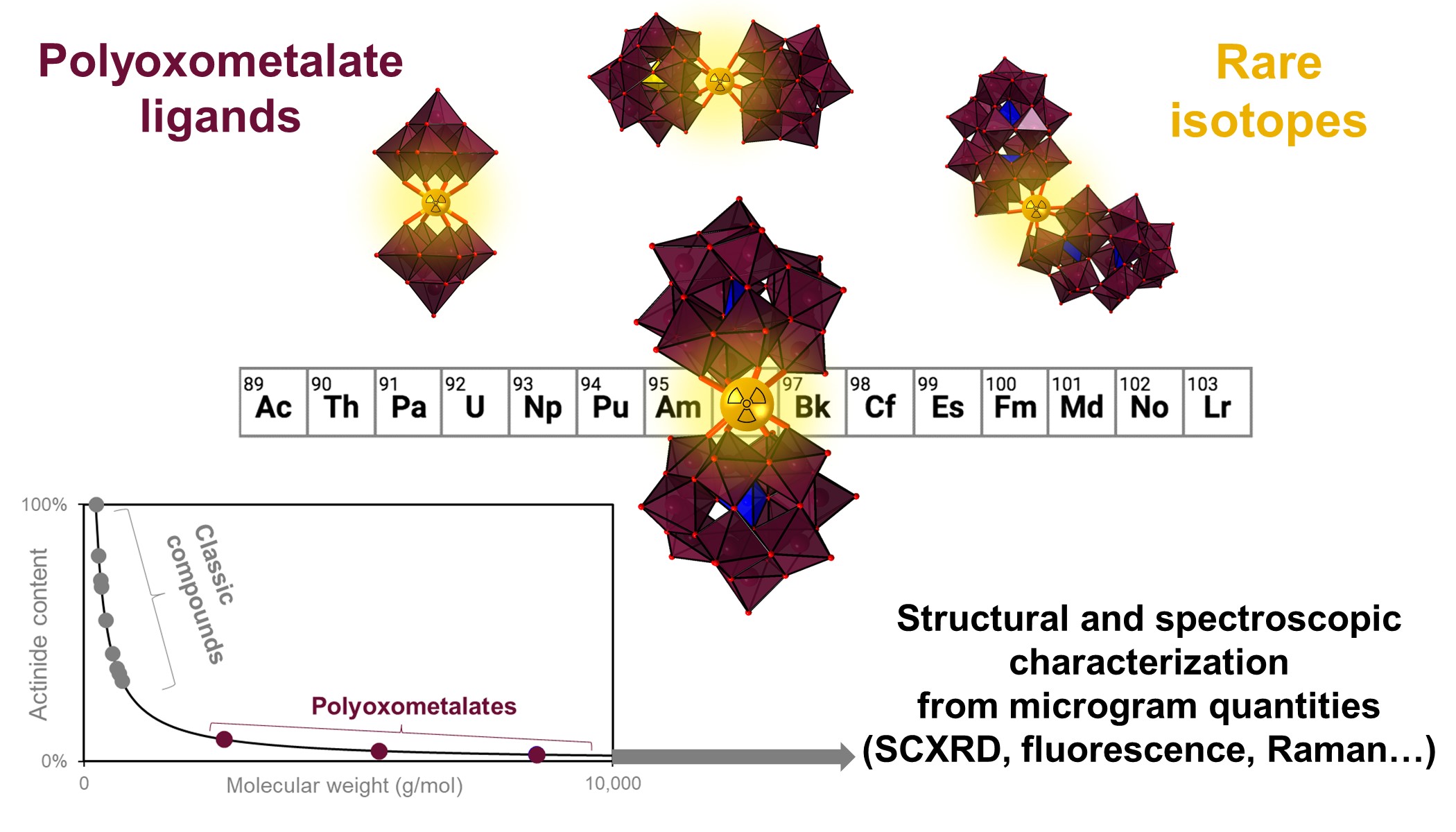 Our proposed method uses "HEAVY POLYOXOMETALATE LIGANDS" (POMs) and enables the facile formation, crystallization, handling, and detailed spectroscopic and structural characterization of complexes containing rare isotopes starting from just 1-10 micrograms. Several new single crystal XRD structures were obtained, including three new compounds of curium (element 96). For context, curium isotopes are not only radiotoxic, but they are also rare and extremely expensive – to a point where just 10 curium complexes had been isolated and characterized by single crystal X-ray diffraction since the discovery of this element in 1944. The newly proposed method significantly decreases the radiation exposure to the workers, preserves isotope resources, and drastically cuts costs. The newly proposed POM-based approach could be used to discover and study many new compounds containing rare isotopes, such as actinides and radiolanthanides, hence allowing scientists to unravel bonding trends (and perhaps isotopic trends) in the periodic table. Furthermore the POM-based approach also offers a viable path to isolate and study coordination compounds of elements that have remained out of reach with previous methods, such as actinium, transcalifornium elements, and more.
