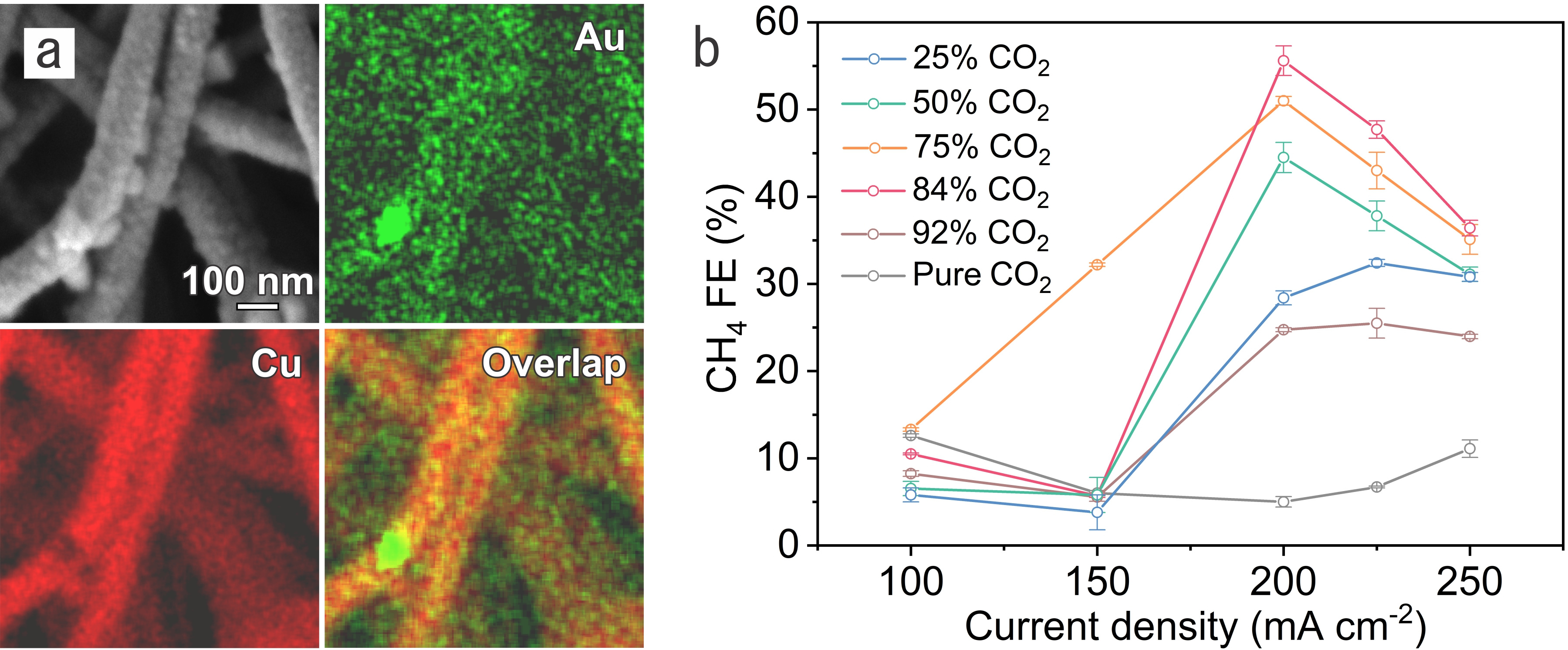 Figure. a, Secondary electron image and the corresponding energy-dispersive X-ray spectroscopy elemental mapping of Au and Cu for the 7% Au-Cu/PTFE catalyst. b, Methane FEs on 7% Au-Cu/PTFE at various CO2 concentrations.