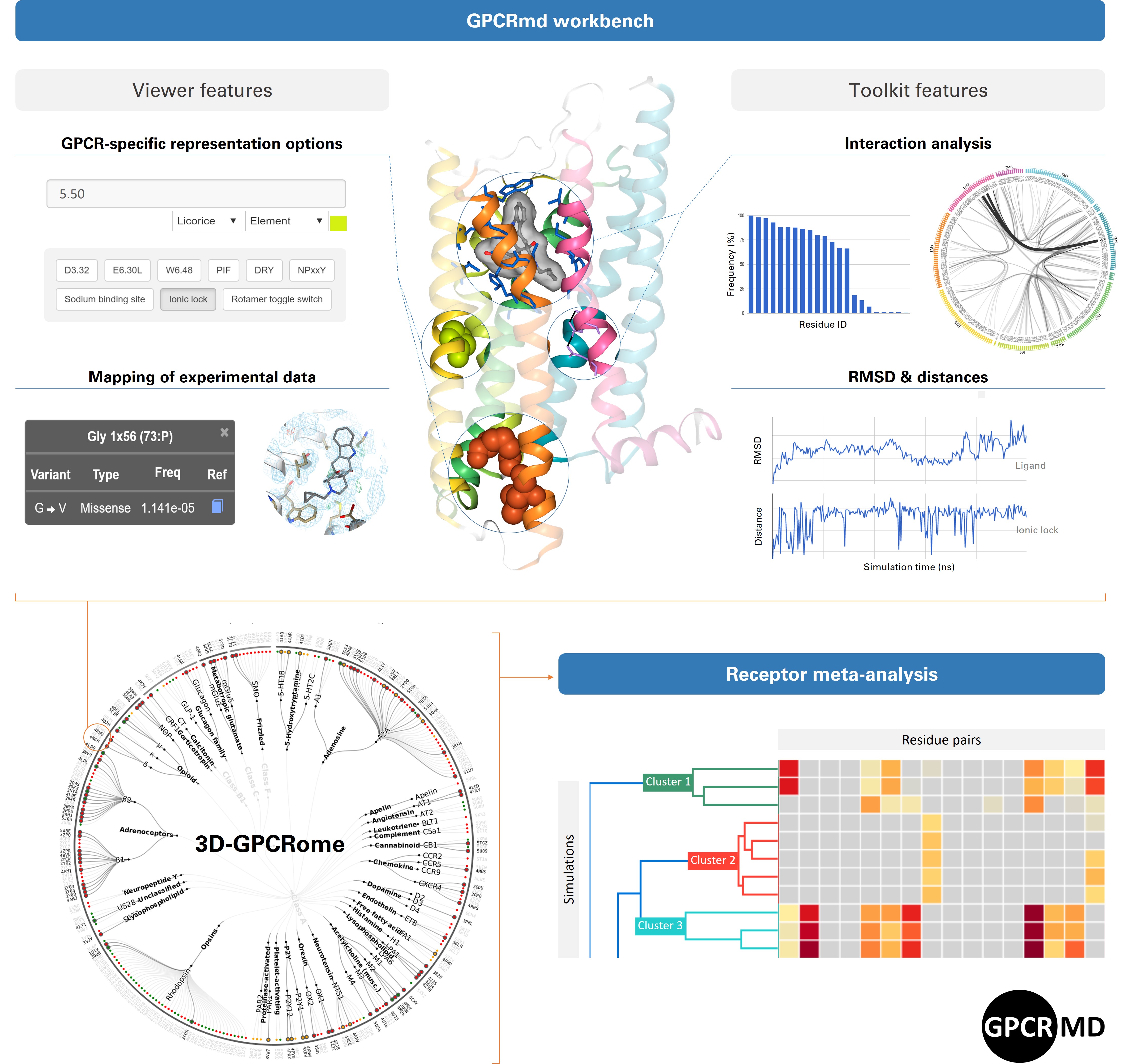 We then needed to effectively share all this data and make it accessible for both MD experts and non-experts. For that, we built the online platform of GPCRmd (Figure 3). Apart from providing easy and free access to all the simulation data that we generated, our platform is intended to simplify the analysis of such data. Thus, we equipped it with fast, intuitive, and easy-to-use tools for the visualization and analysis of the simulations. We also included large-scale analysis tools to cluster and compare the simulations of different receptors based on their interaction patterns. This feature is especially valuable, as inspecting such an extensive dataset can help to uncover both universal or specific mechanisms that govern the structural dynamics of these receptors. As an example, in our publication, we demonstrate how this tool can be used to pinpoint differences in the water-mediated networks of the β2-adrenoceptor and OX2-receptor, potentially involved in receptor activation and G protein coupling. Also, in case anyone prefers to perform their own analyses, it is possible to freely download the data in GPCRmd and study it with external software or analysis scripts.