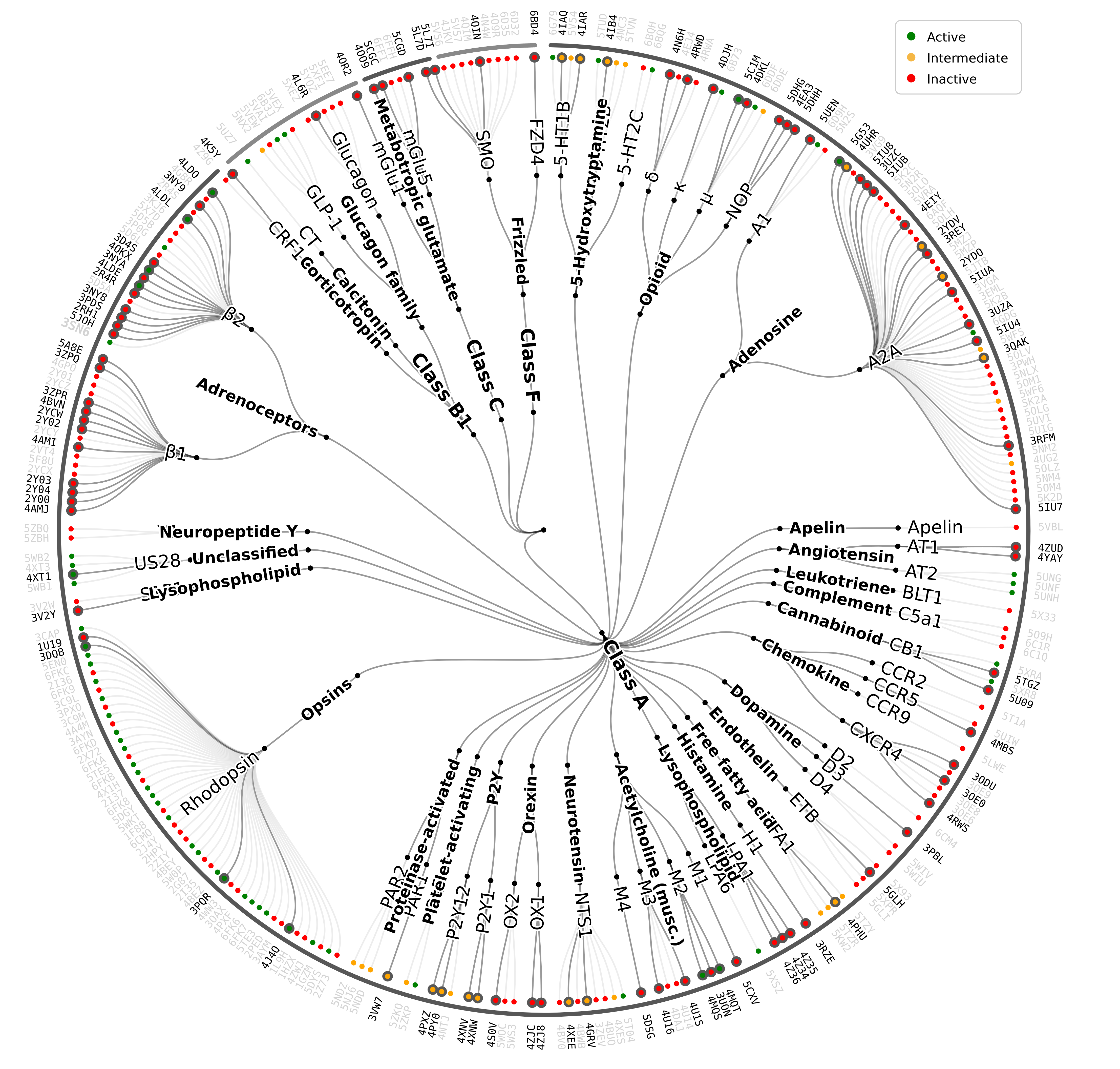 Knowing the potential of MD simulations, we wanted to find a way to make this valuable data accessible to the whole community of scientists studying GPCRs -the motivation that originated the idea of GPCRmd (www.gpcrmd.org). We aimed to create an open-access platform to freely share MD data and include in it simulations of as many GPCRs as possible. However, we knew that this idea was ambitious and that we could not make it alone: we needed the support of a strong community for the development and later sustainability of such a platform. Thanks to the motivation and efforts of many other researchers who share our vision, we constituted the GPCRmd community, including research groups of 23 institutions from 10 different countries in Europe and the US. With them, we joined expertise to generate a common simulation protocol and use it to simulate around 70% of the 3D-GPCRome (Figure 2), which is the set of GPCR subtypes with solved structure.