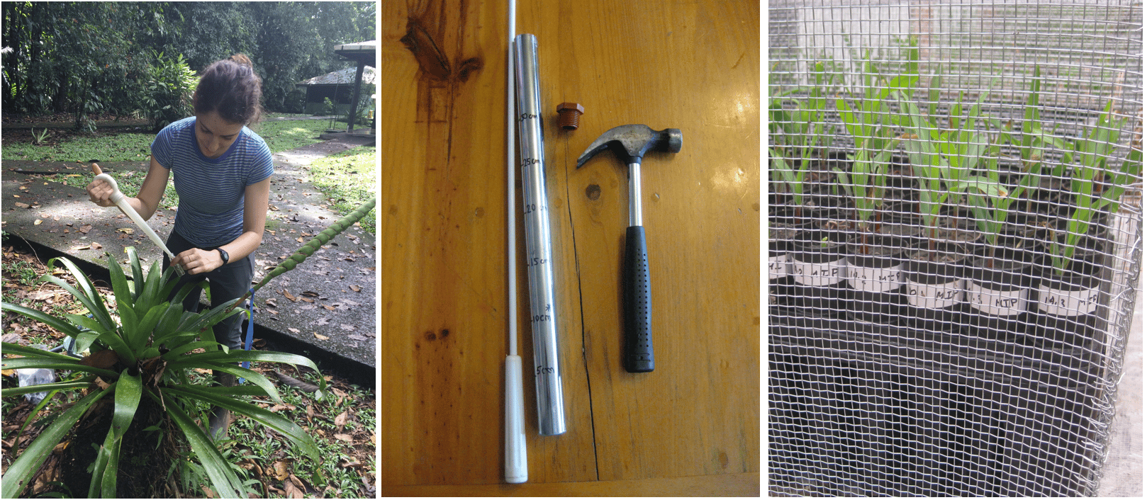 Figure 1. Basting a bromeliad, homemade soil corer, and mouse-proofing experimental corn plants