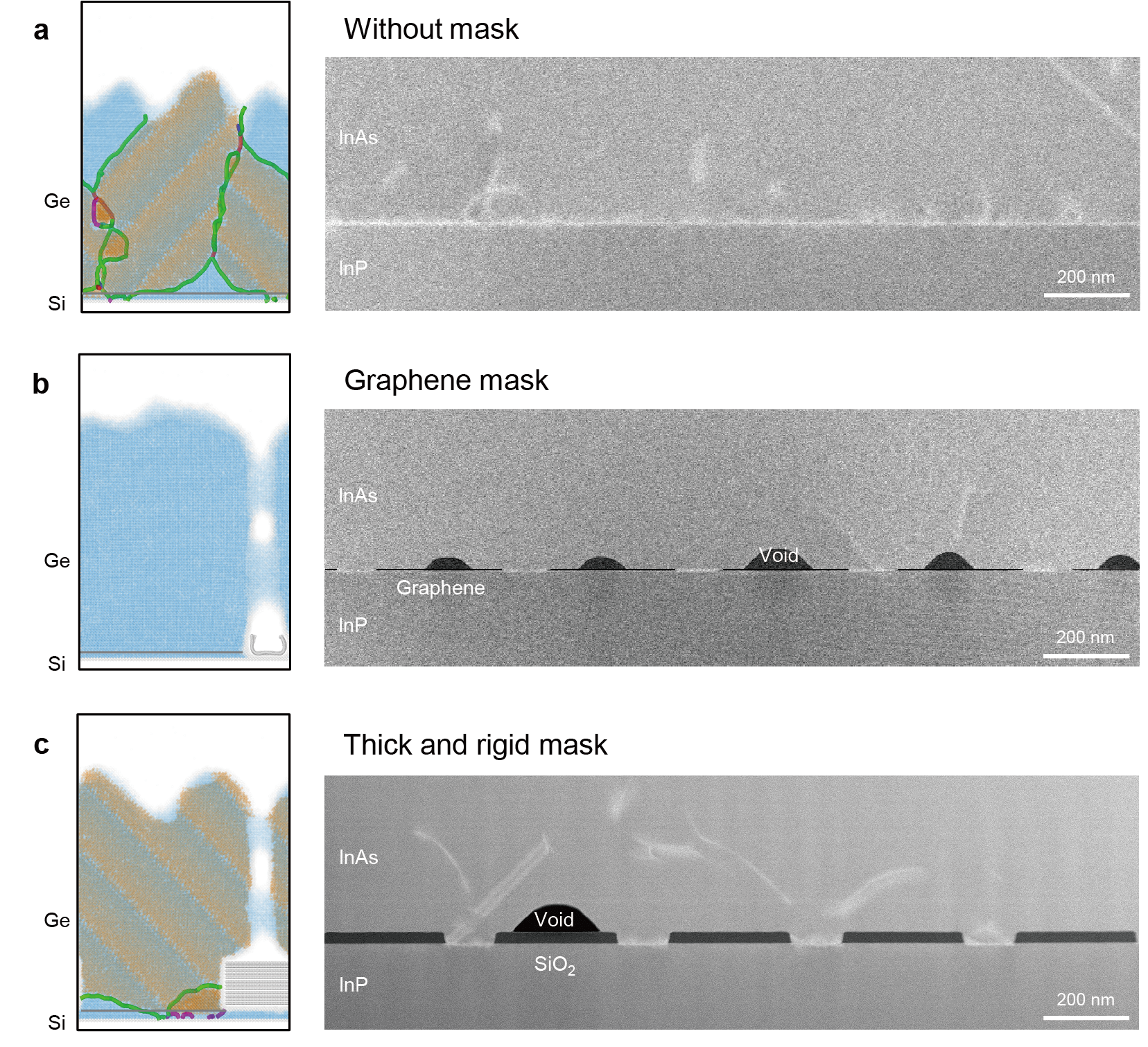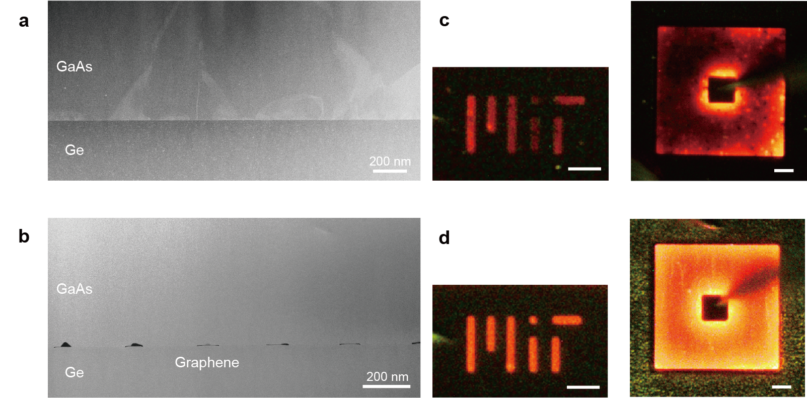 More surprisingly, we found an additional, yet far-reaching, benefit of nanopatterned graphene interlayer in polarity- and lattice-mismatched heteroepitaxial systems, where it substantially reduces crystallographic defects such as antiphase boundaries, misfit dislocations, and threading dislocations. Although antiphase boundaries are in general unavoidable in compound semiconductor films grown on elemental substrates, nanopatterned graphene effectively eliminates the formation of such defects in GaAs epitaxial layer on Ge substrate when its step edges are blocked by the graphene surface. Light-emitting diodes made up of antiphase boundary-free thin films thus show superior optoelectronic properties compared to its counterpart directly formed on bare Ge substrate (Figure 2). Moreover, a combined experimental and theoretical study revealed that graphene nanopattern serves as an efficient platform to relax misfit strain and therefore significantly reduces defects by a unique mechanism mainly attributed to the flexibility and chemical inertness of graphene surface. As described in Figure 3, our graphene nanopattern promotes the ultimate reduction of dislocations beyond the conventional approaches including direct heteroepitaxy and SiO2 mask-based selective-area epitaxy in the same lattice-mismatched system. Thus, these new findings in this work could suggest an additional promising route towards expanding the material spectrum of freestanding membranes in high quality.