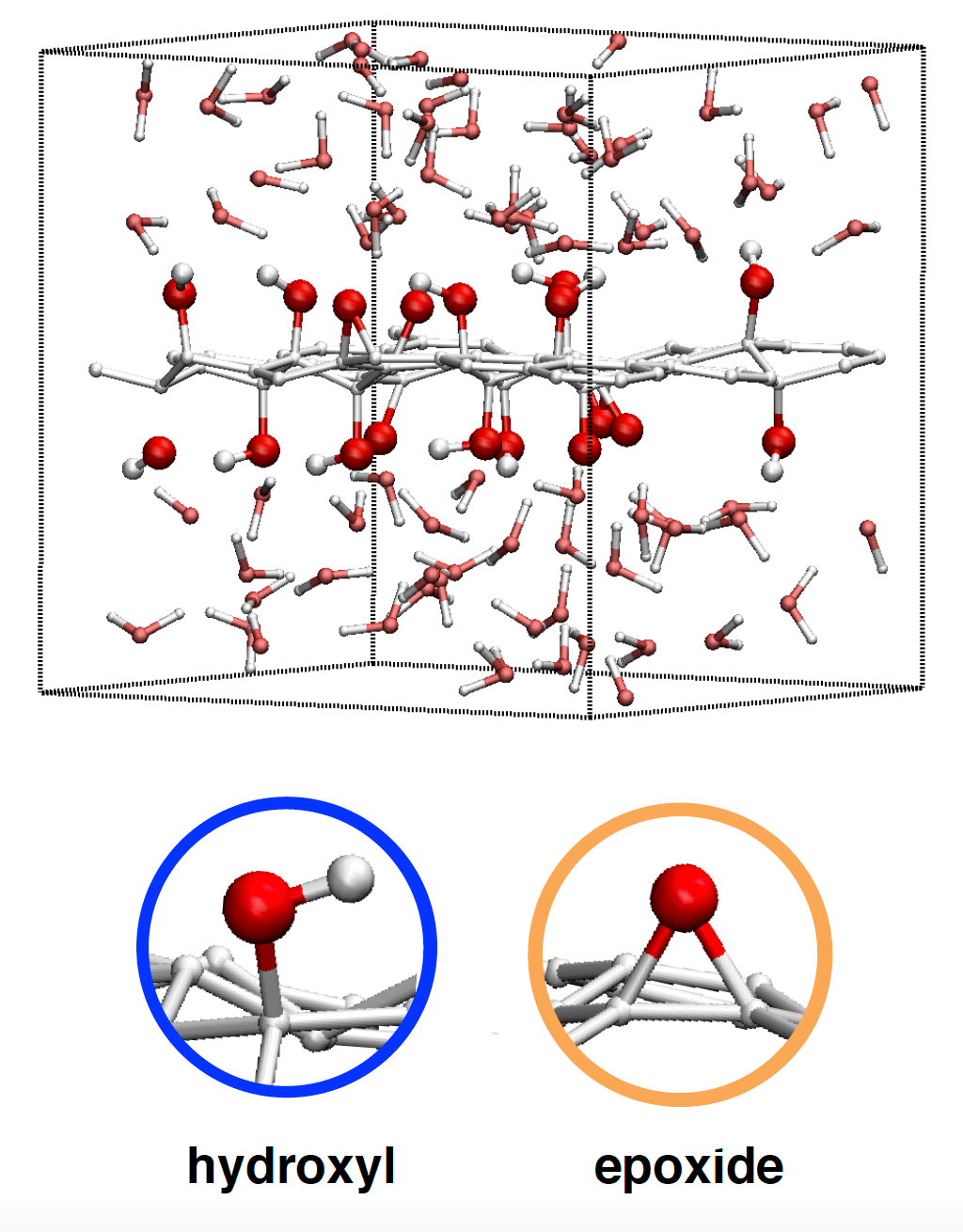 To reach that purpose, it was first necessary to generate a realistic GO layer. The difficulty started already because unlike the prototypical graphene layer, the GO layer is ill-defined at the atomic scale: how many oxidized functions present on the surface? Their nature? Their spatial arrangement over the graphene sheet?
