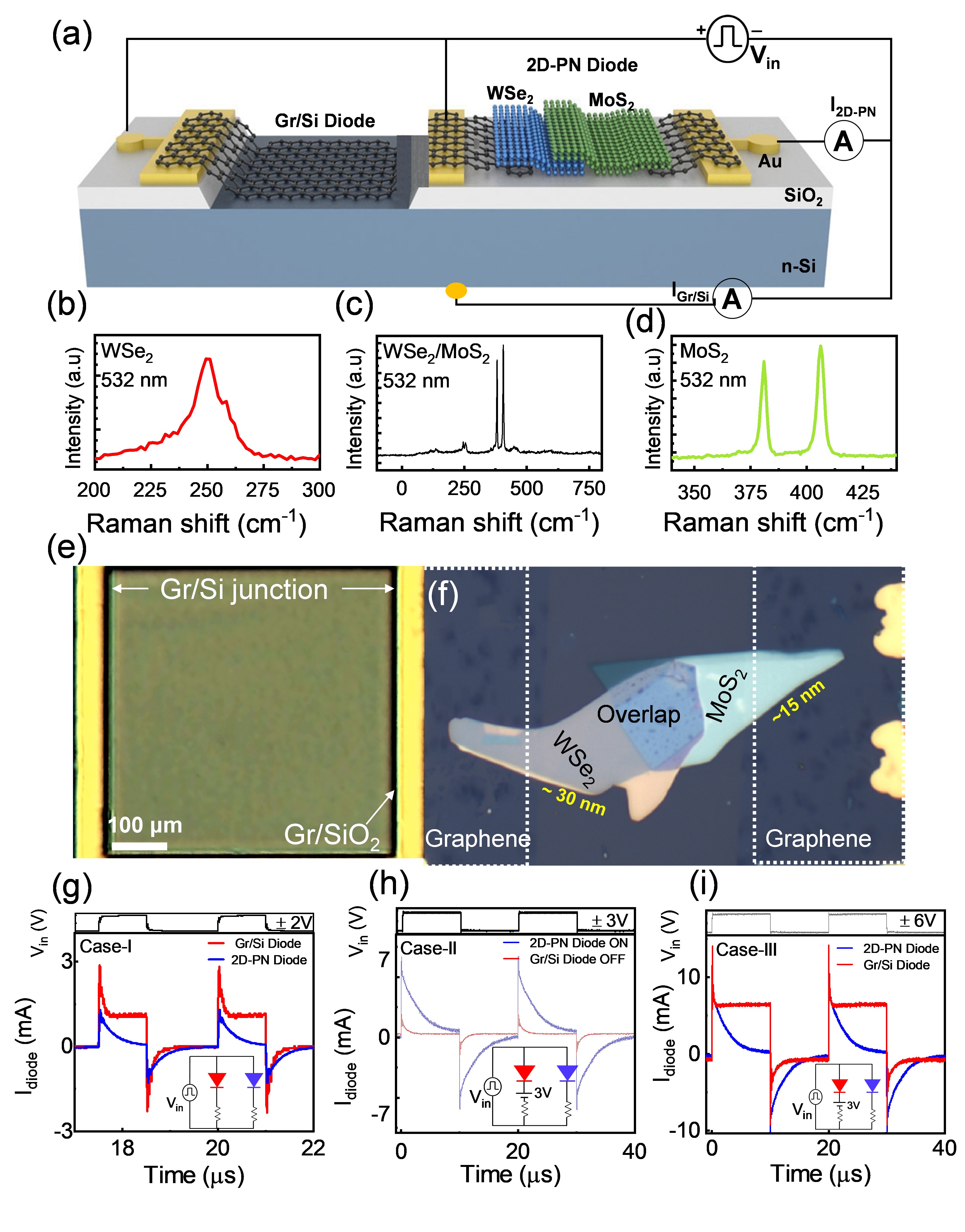 Figure. 1. (a) Cross-section view of Gr/Si protection diode coupled with 2D-PN diode. (b-d) Raman spectra of WSe2, WSe2/MoS2, and MoS2 heterostructure (e, f) Optical image of the Gr/Si Schottky and 2D-PN diode heterostructure. (g-i) The current temporal response through 2D PN and Gr/Si Schottky diode with three configurations