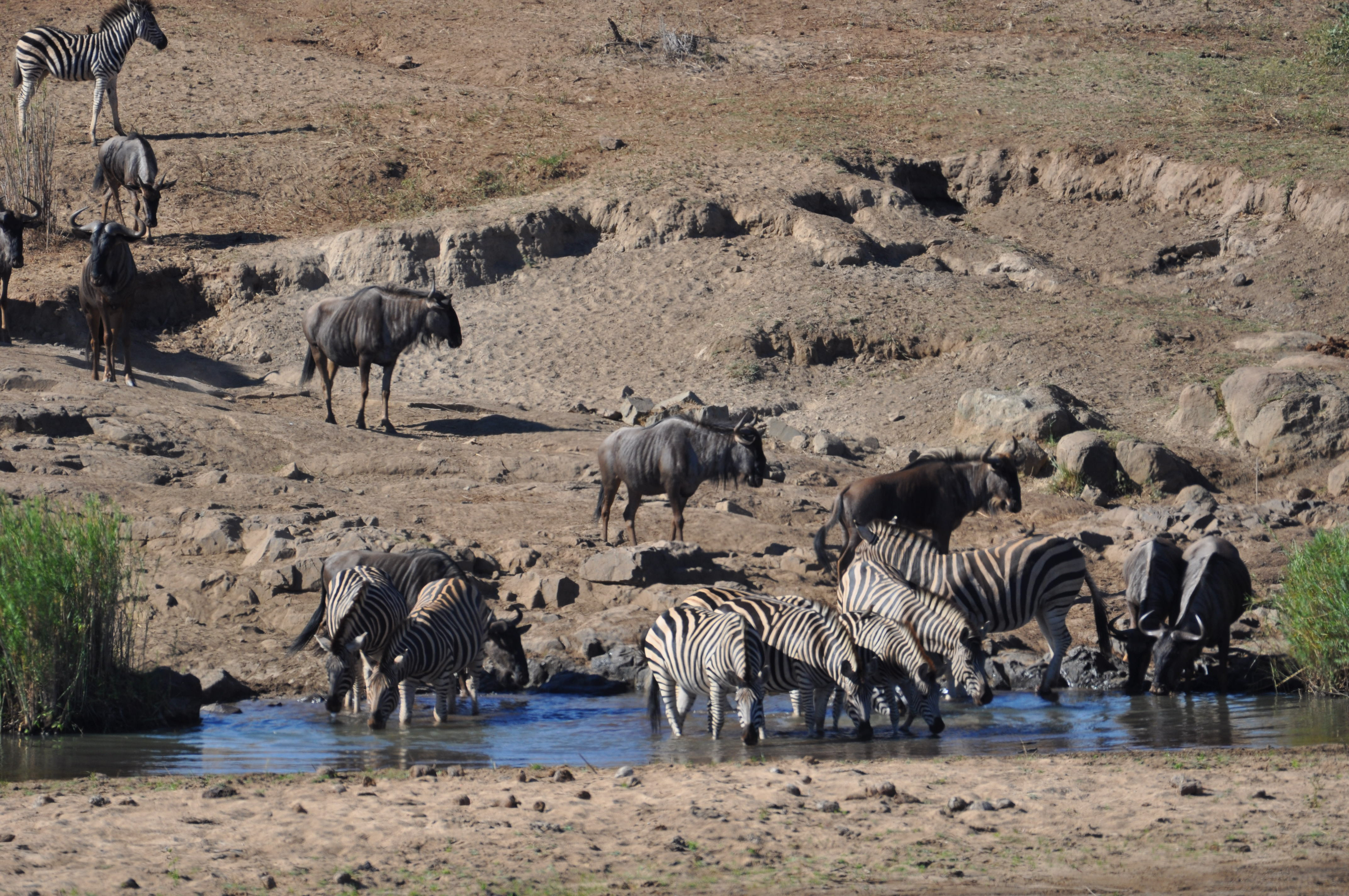 Blue wildebeest (Connochaetes taurinus), plains zebra (Equus quagga) drink in an arid region of Kruger National Park, South Africa. Photo credit: Kaye E. Reed.