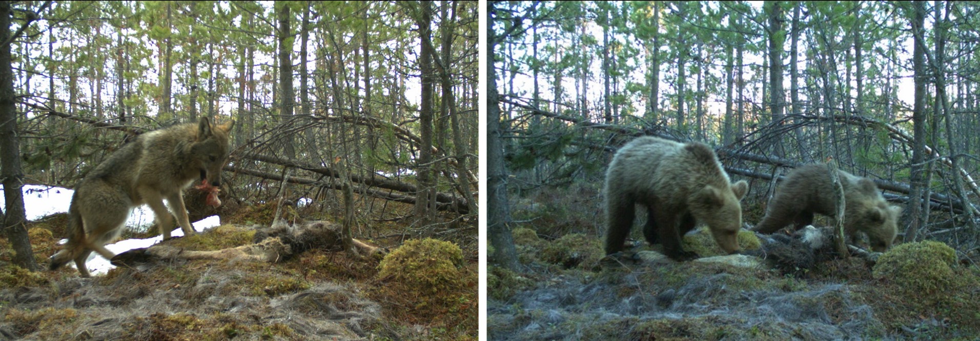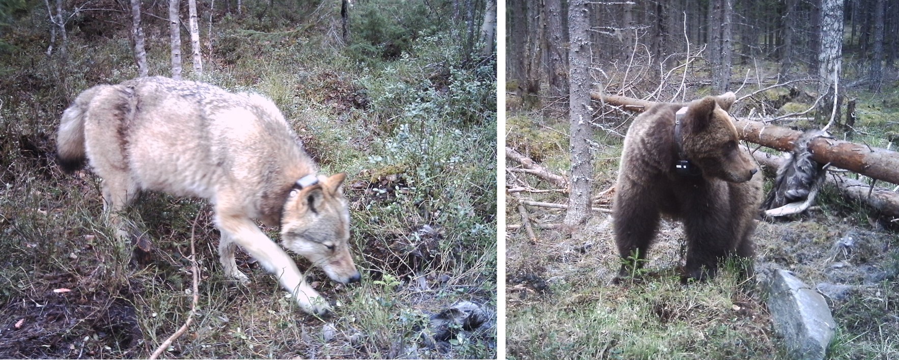 Photos taken by camera traps of a gray wolf and a brown bear previously radio-collared by the Scandinavian Wolf and Bear Research Projects © SKANDULV and SBBRP.