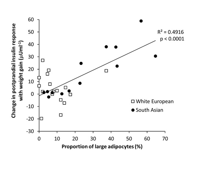 A key observation in this study was that both the size distribution of adipocytes at baseline, and the changes with weight gain, were associated with the extent of the metabolic changes in response to weight gain. Having a greater proportion of large adipocytes at baseline, a smaller proportion of small adipocytes at baseline, and a smaller decrease in the proportion very small adipocytes with weight gain – all of which were evident in South Asians – were all associated with a greater adverse metabolic response to weight gain. The figure below illustrates the association between the proportion of large adipocytes at baseline and the change in the postprandial insulin response with weight gain. This suggests that ethnic differences in adipocyte morphology may be an important driver of South Asian men’s augmented adverse metabolic response to weight gain.