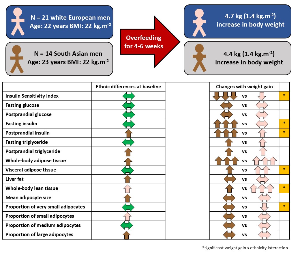 A limitation of the existing literature was that the evidence was largely cross-sectional: it is known that South Asians with higher BMIs exhibit greater metabolic dysfunction than white Europeans with similarly high BMIs, but not whether the metabolic consequences of weight gain within an individual differ between people of South Asian compared with white European ethnicity. To address this, the Glasgow visceral and ectopic fat with weight gain in South Asians (GlasVEGAS) study recruited 14 South Asian and 21 white European men in their early 20s, with starting BMIs of ~22 kg.m-2, and asked them to undertake an overfeeding intervention to gain 5-7% of their bodyweight over 4-6 weeks. We assessed their metabolic responses to consuming a mixed meal, measured their body composition by magnetic resonance imaging and spectroscopy, and took abdominal subcutaneous adipose tissue biopsies at baseline (i.e. before weight gain) and after weight gain.