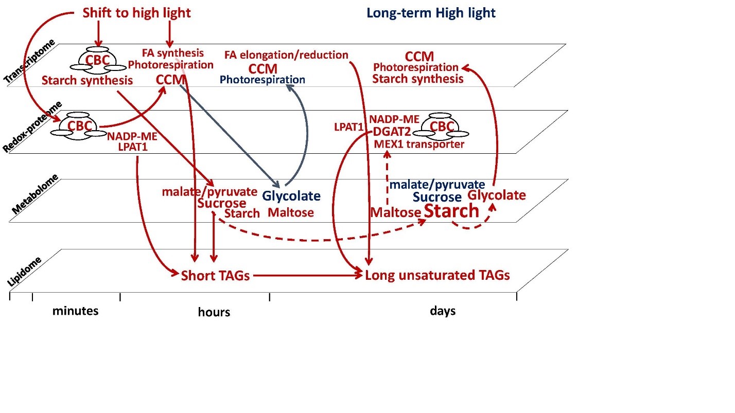 Figure: Multi-omics illustration of C. ohadii temporal responses of photosynthesis and central C metabolism to EIL treatments. Genes, proteins, metabolites and lipids presented showed significantly higher (red) or lower (blue) levels of expression, redox-response, and accumulation, respectively. Arrows illustrate potential positive (red) and negative (blue), direct (solid line), and indirect (dashed line) effects.