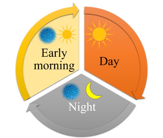 Figure: Schematic view of desert BSC diurnal cycle (Extended Data Figure 10 in the applying publication). Main water supply is by dew formation during the night, followed by morning dehydration. Through most of the day, crusts are dry and exposed to extreme illumination (~2000 µmol photons m-2 s-1).