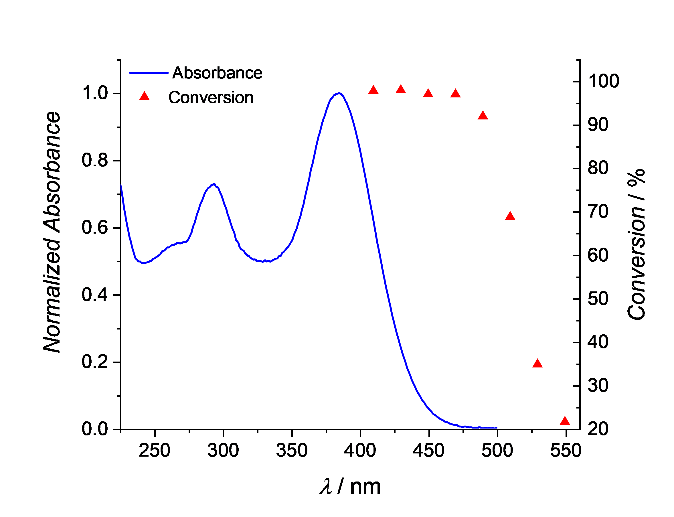 Fig. 1 Action plot and absorption spectrum of styrylquinoxaline moiety showing the red-shift in its reactivity compared to its absorption spectrum.