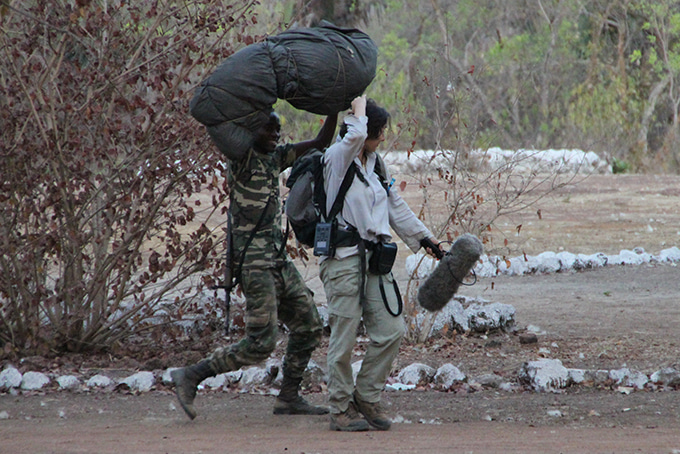 carrying a stuffed leopard and gear for recording the animals