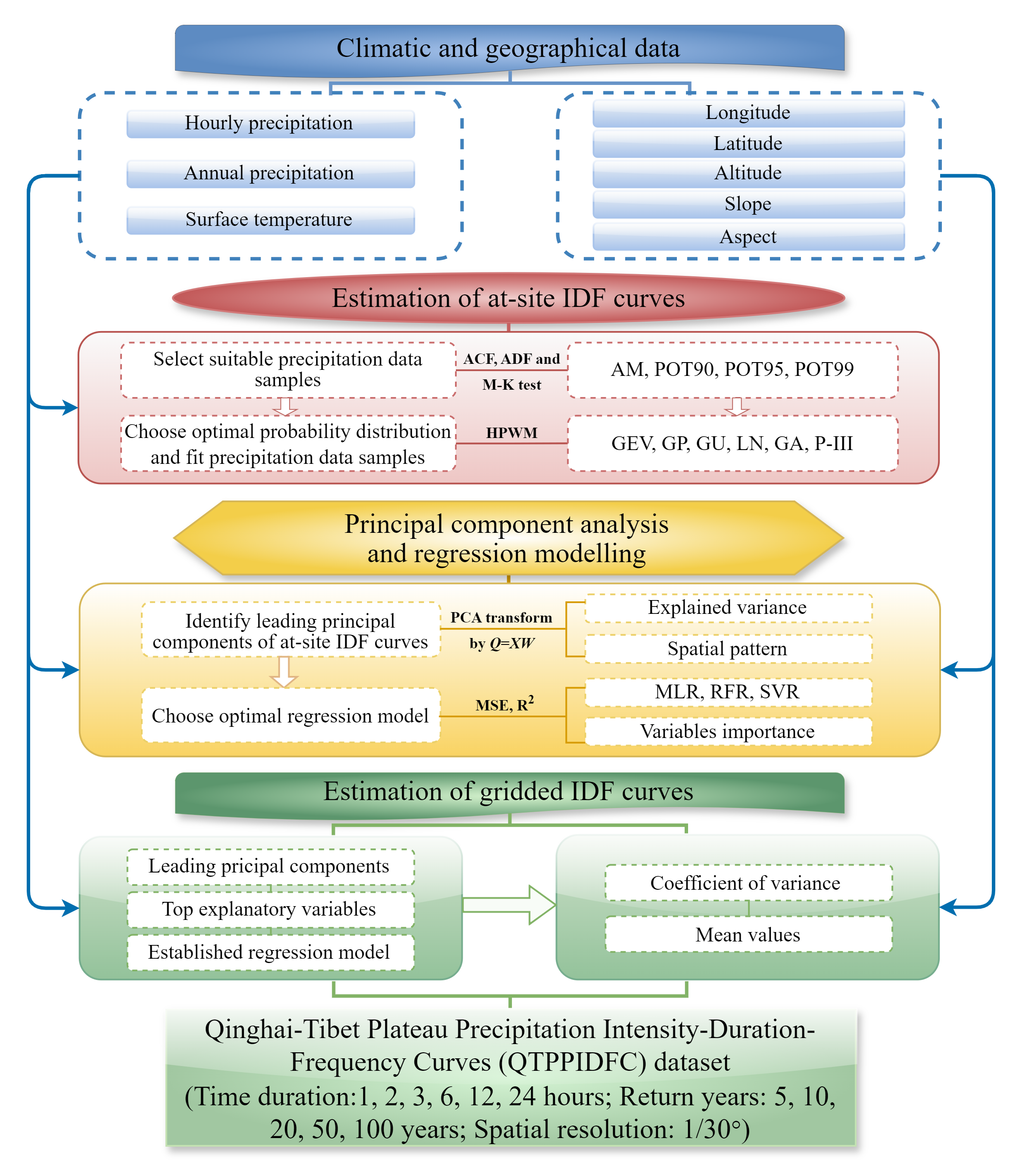 For filling the data gap, we collected observed hourly precipitation data at 203 weather stations in and around QTP (Figure 1), and used the annual maxima sampling method to extract the annual maxima hourly precipitation data samples. We found that the generalized extreme value distribution performs the best in fitting these hourly precipitation data samples, based on which the at-site IDF curves were estimated. Considering the high spatial inhomogeneity in extreme precipitation characteristics and the sparse distribution of limited rainfall stations in QTP, we alternatively applied the principal component analysis (Figure 2) to identify the southeast-northwest spatial pattern of at-site IDF curves, and its first principal component gives an explained variance as high as 96%. Finally, we did spatial interpolation using the established random forest model to estimate gridded IDF curves, with geographical and climatic variables as explanation factors.