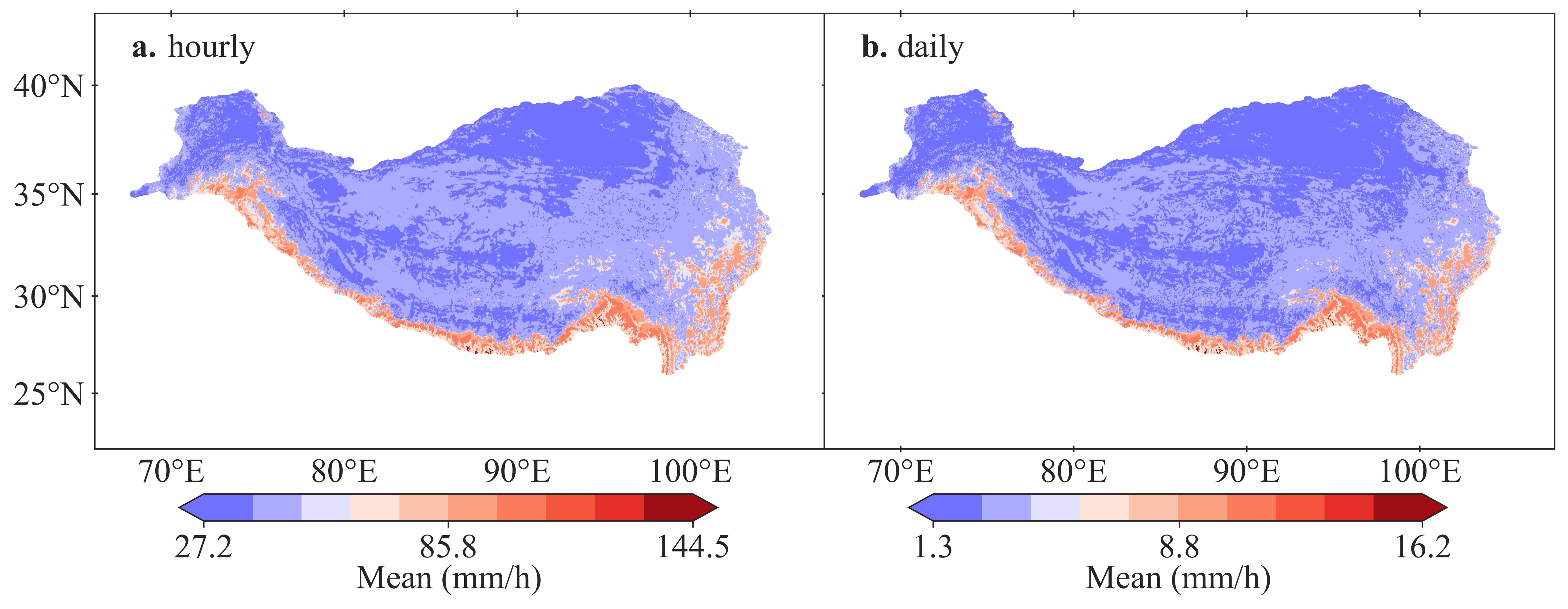 Figure 3. Spatial distribution of the estimated gridded hourly precipitation intensity (a) and daily precipitation intensity (b) in 100 return years in QTP, with a 1/30° spatial resolution.