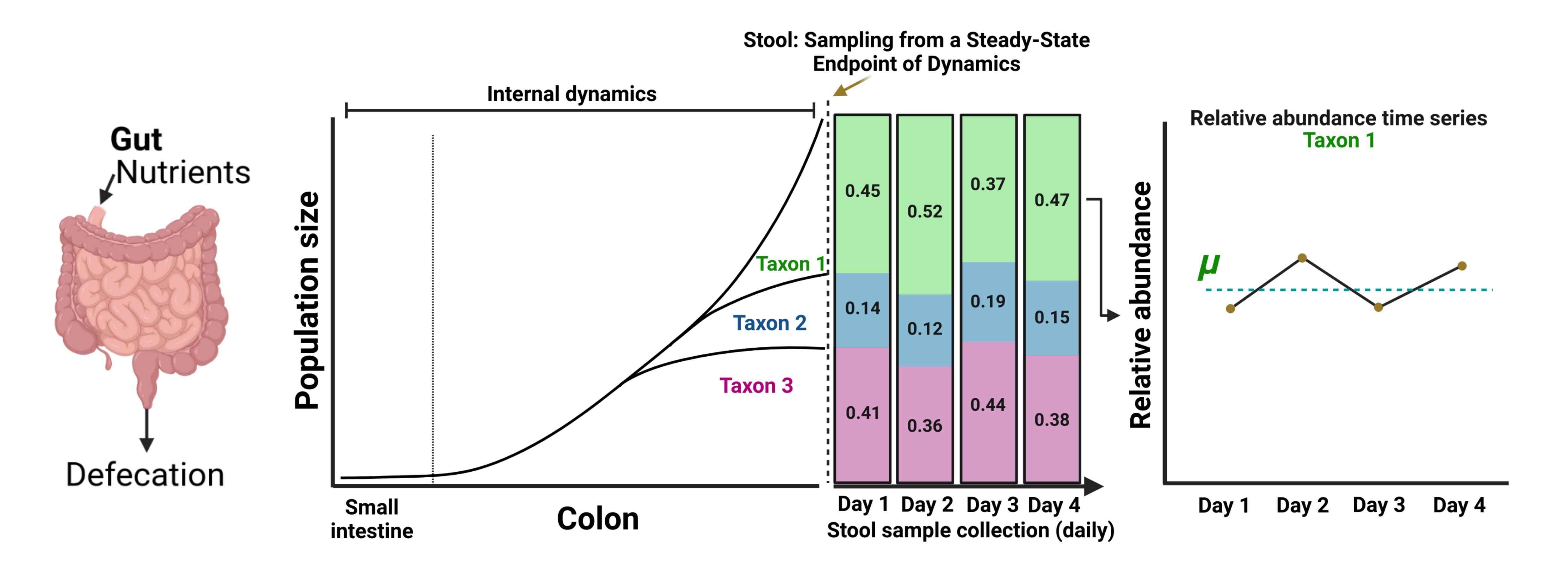 Longitudinal sampling of stool has provided important insights into the ecological dynamics of the human gut 1,2. There has been increasing interest in long-term monitoring of the gut microbiome for clinical trials, enabled by technologies like smart toilets 3,4. However, the interpretation of these dynamics has been fraught due to an under-appreciated disconnect between population dynamics in the gut (that occur on minute-to-hour timescales) and sampling timescales of human stool (around once per day).