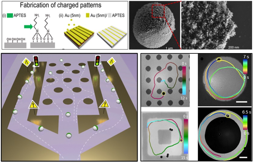 In our recent work, we address this challenge and demonstrate that charged colloidal Janus micromotors can serve as a model system of ‘macro-ions’ moving in the microscopic assembly. While the motion of such spherical Janus micromotors is light activated, guidance of their motion is provided by the interaction of the particles with the complex chemical pattern possessing the surface charge distribution (see Figure, bottom left). These topographically flat charged patterns are realized on a chemically functionalized substrate containing regions of positive and negative Zeta potentials, which enable long-range (attractive and repulsive) potentials affecting the motion of charged Janus particles.