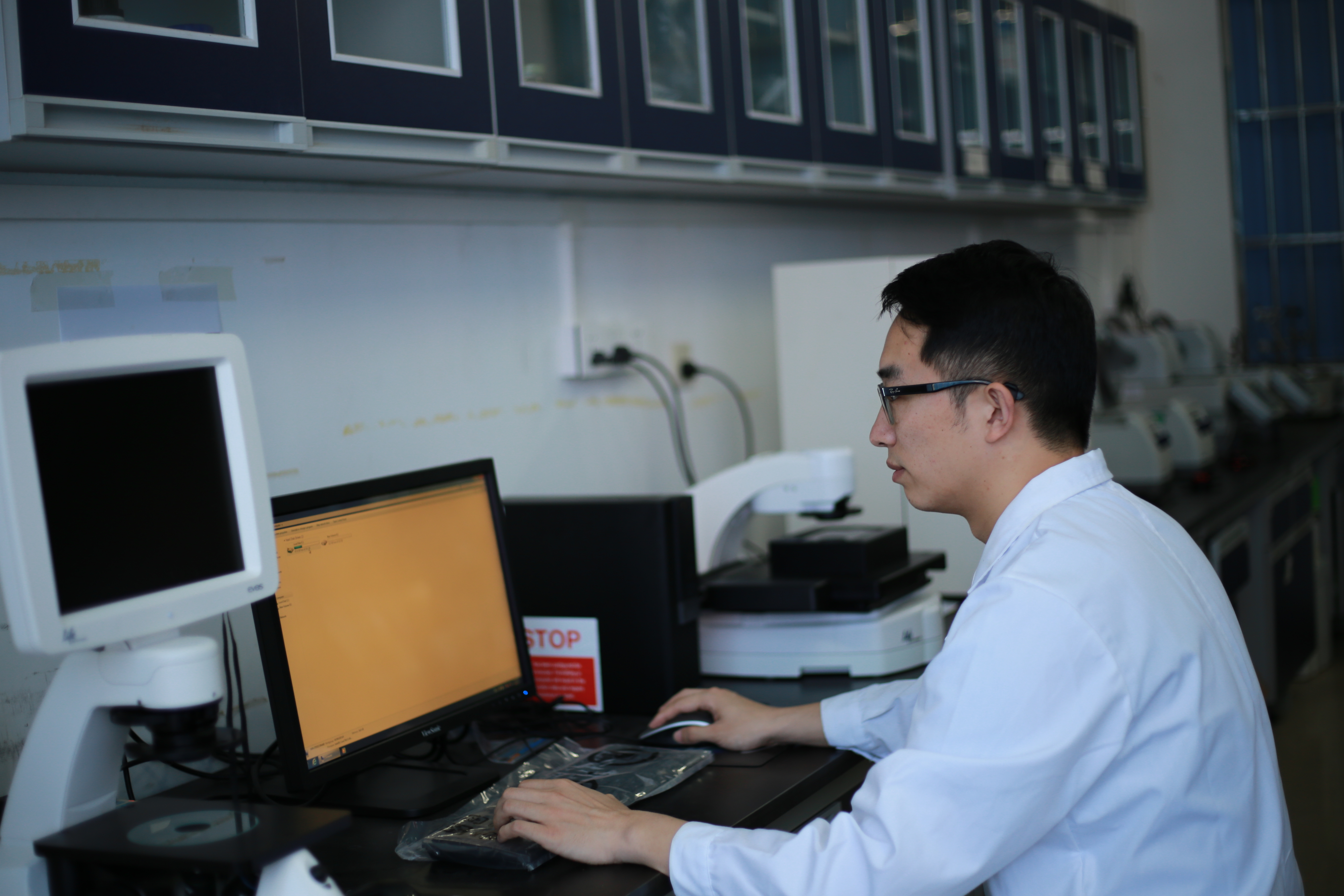 Photo 1. Zijun Guo is identifying the CF-BD with Fluorescence in situ hybridization. Photo credit: Daifeng Cheng.