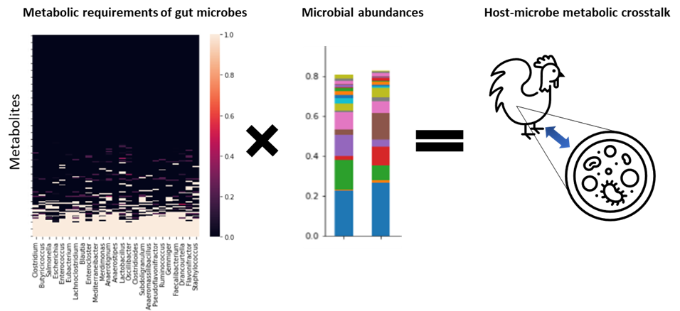 In order to achieve this vision, we need to differentiate cases in which microbes are driving increased performance from cases where performance is driving microbial abundances. In our study, we focused on the metabolic requirements for microbial growth in the chicken gut to make a case for causality. Starting from the metagenomics annotations and taking advantage of novel methods for statistical modeling of microbial genomic content [3], we developed draft metabolic reconstructions of the core members of the gut microbiota of the chickens in our study. Because many of the functional differences induced by AGP could be traced to these core microbes, then the way those differences constrain gut microbial metabolism as a whole can shed light onto how gut microbes impact host physiology.