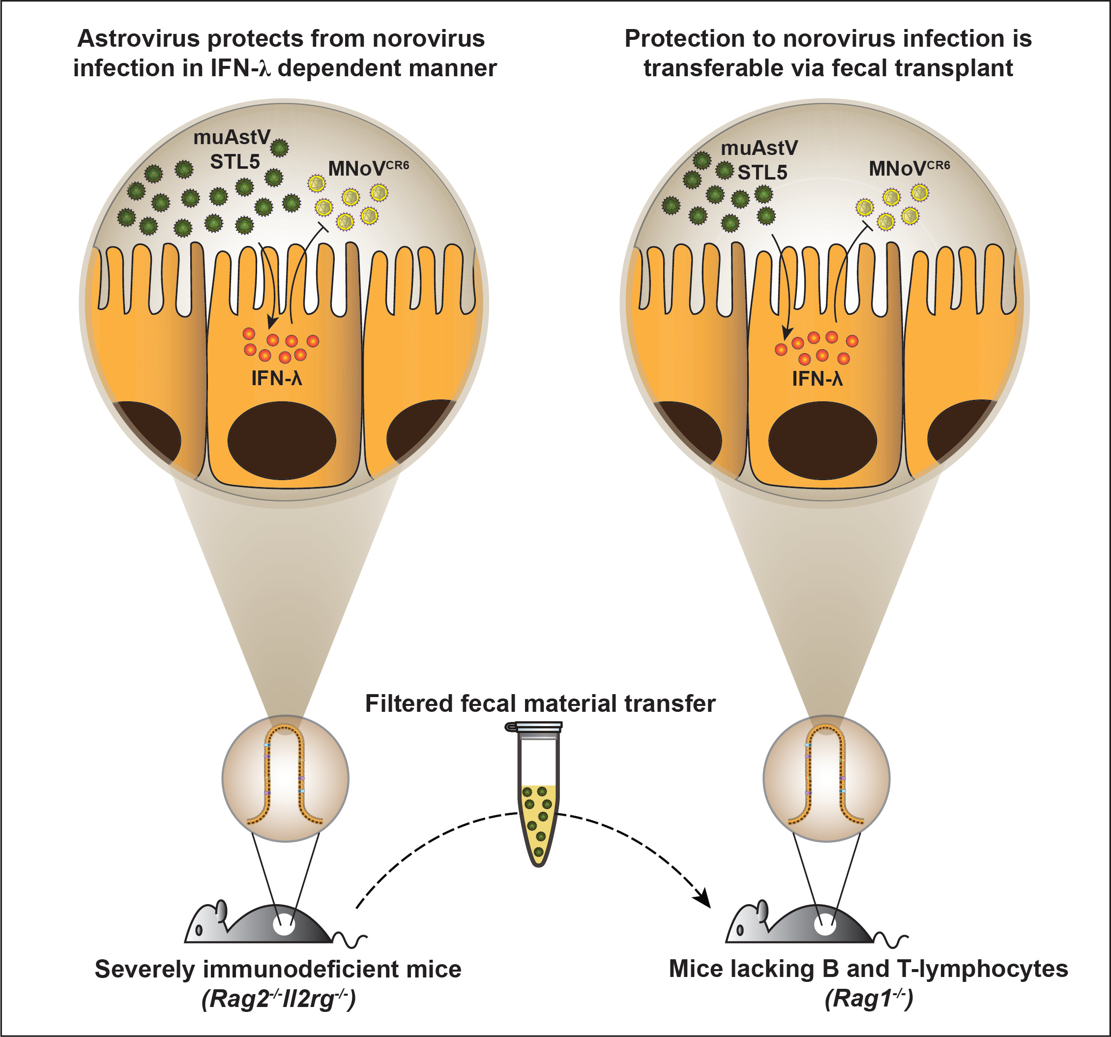 In the Baldridge lab, we are fascinated by the world of microbes and their potential to alter responses towards various pathogens. By chance, we uncovered a totally unexpected phenotype in immunodeficient mice infected with mouse gut pathogens such as murine norovirus (MNoV) and rotavirus. Surprisingly, despite being markedly immunodeficient, these mice were fully protected from infection by these pathogens. We were enthusiastic to uncover the mechanism underlying this paradoxical finding.