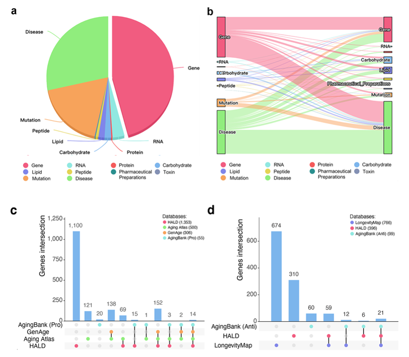 Up to September 2023, we had annotated 339,918 abstracts from PubMed and curated 12,227 entities in 10 types (gene, RNA, carbohydrate, peptide, lipid, protein, pharmaceutical preparations, toxin, mutation, and disease entities), 115,522 relations, 1,855 aging biomarkers, and 525 longevity biomarkers in HALD. The distributions of entities and relations are shown in Fig. 2a,b.