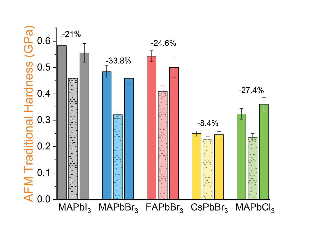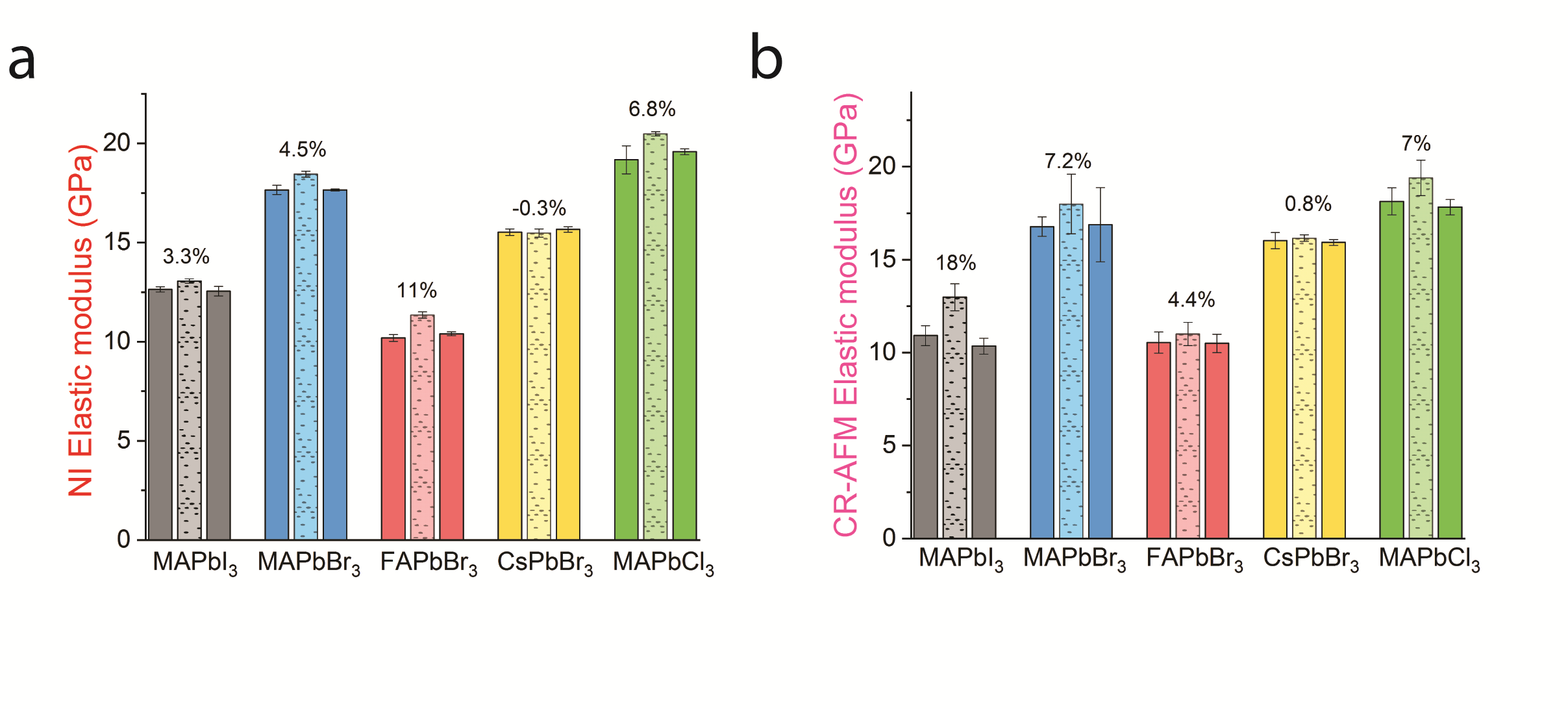 Figure 1. (a) Bulk elastic moduli obtained by nanoindenter measurements and (b) near-surface elastic moduli measured using atomic force microscopy in halide perovskite single crystals. For each triplet, solid bars represent the dry state measurements before (left) and after (right) subjecting to humid environment (middle - dotted bars). The difference between dry and humid states for each set is specified by the percentage values.
