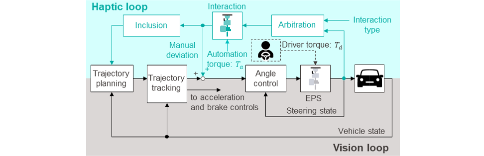 This concept is inspired by human-human collaboration. Specifically, when two human agents work together to carry a desk, first, they communicate their intention via interactive force to allocate roles and to negotiate the direction to go. When a robot is interacting with a human, the role allocation is achieved by changing the type of interaction such as collaboration, competition, etc. (see the detail in the paper). Arbitration (robot control) of the selected type of interaction is performed by assimilating the human sensorimotor control (goal and impedance) and adapting accordingly to the robot response. When the haptic communication is settled, each agent adjusts their motion accordingly. For the automated driving application, it is necessary to decide the type of interaction based on the traffic conditions and the driver status. In this research, we are interested in how to enable joint collaborative steering assuming that the decision on the type of interaction is available. Three functions have been developed: “interaction” to provide a control environment to the steering system where driver and automation can coexist, “arbitration” which sets the automation dynamics based on the preselected type of interaction and “inclusion” to assimilate the driver intention to the trajectory planning of the automation. Actual vehicle evaluations by several drivers demonstrated the capability of the proposed multi-level framework to enable smooth collaborative steering operations with less effort for drivers.
