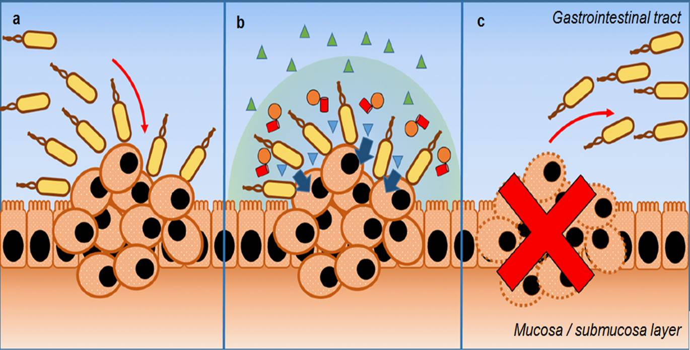 Figure 1 | Engineered microbe for adenocarcinoma clearance. Engineered microbes administered orally bind to the surfaces of colorectal cancer cells (a), allowing microbes to secrete myrosinase, which converts ingested dietary glucosinolate (b). Upon cancer cell clearance, the microbes are released from the surface of the intestinal mucosa layer (c). Figure adapted from ref.1, Macmillan Publishers.