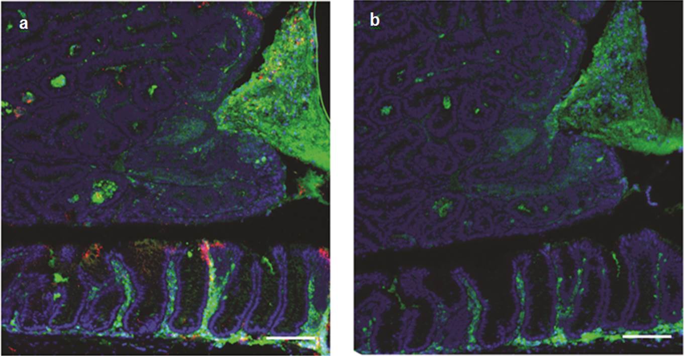 Figure 2 | Tissue sections from mice treated with AOM/DSS stained with Alexa Fluor 488 conjugated anti-HSPG (green). Tissues were incubated with RFP expressing Escherichia coli Nissle (red), and HlpA expressing Escherichia coli Nissle (b). RFP is shown in red. All nuclei in tissue sections were stained with DAPI (blue). Scale bar, 10 mm. Figure adapted from ref.1, Macmillan Publishers.