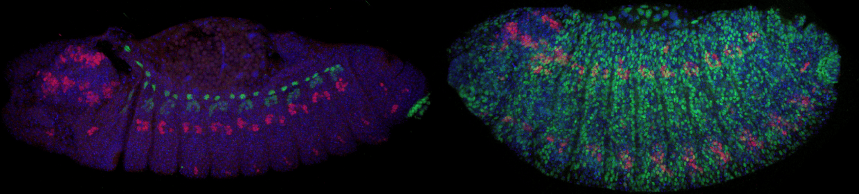 Antibody stains by co-author Michael Perry. Left is a SPECIES selfcross with normal eve expression. Right is a SPECIES outcross with lethal eve overexpression.