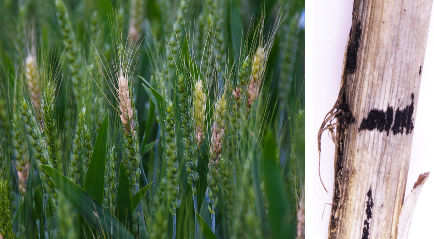 Wheat heads with Fusarium head blight symptoms on a few spikelets (left-hand panel), and the fungal fruiting body on a stubble (right-hand panel).