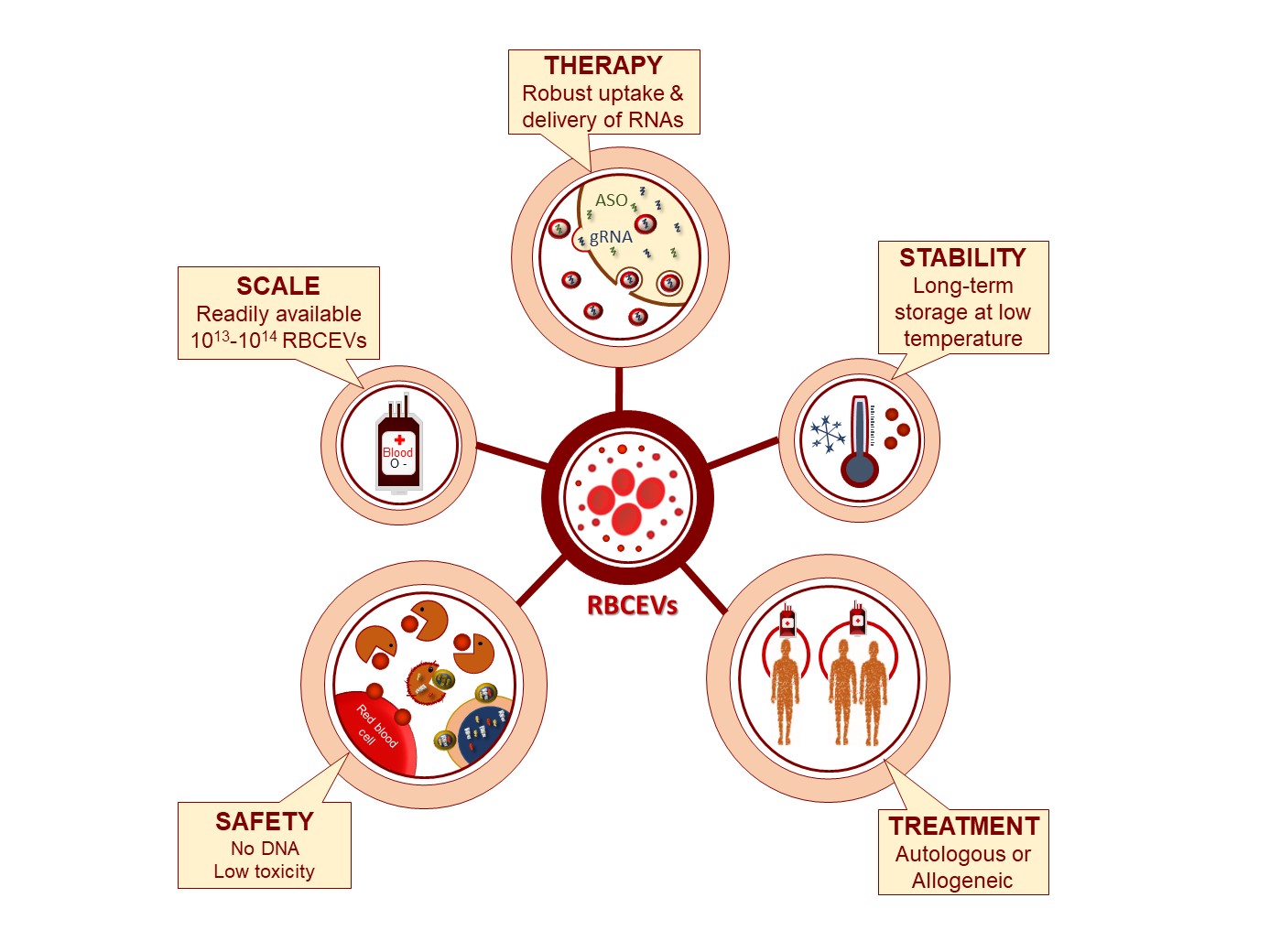 For us, the most remarkable feature of the RBCEV platform is the ease of getting the EVs in large quantities without any expensive and labor-intensive culture. The beauty of this platform is the robust delivery to many cell types, including leukemia cells, and the safe contents of RBCEVs, which are devoid of DNA, growth factors, or potentially immunogenic and toxic substances because RBCs are enucleated ghost cells. We are currently working on further characterization and modification of RBCEVs so that we can completely weaponize the platform for cancer-specific delivery of gene therapies.