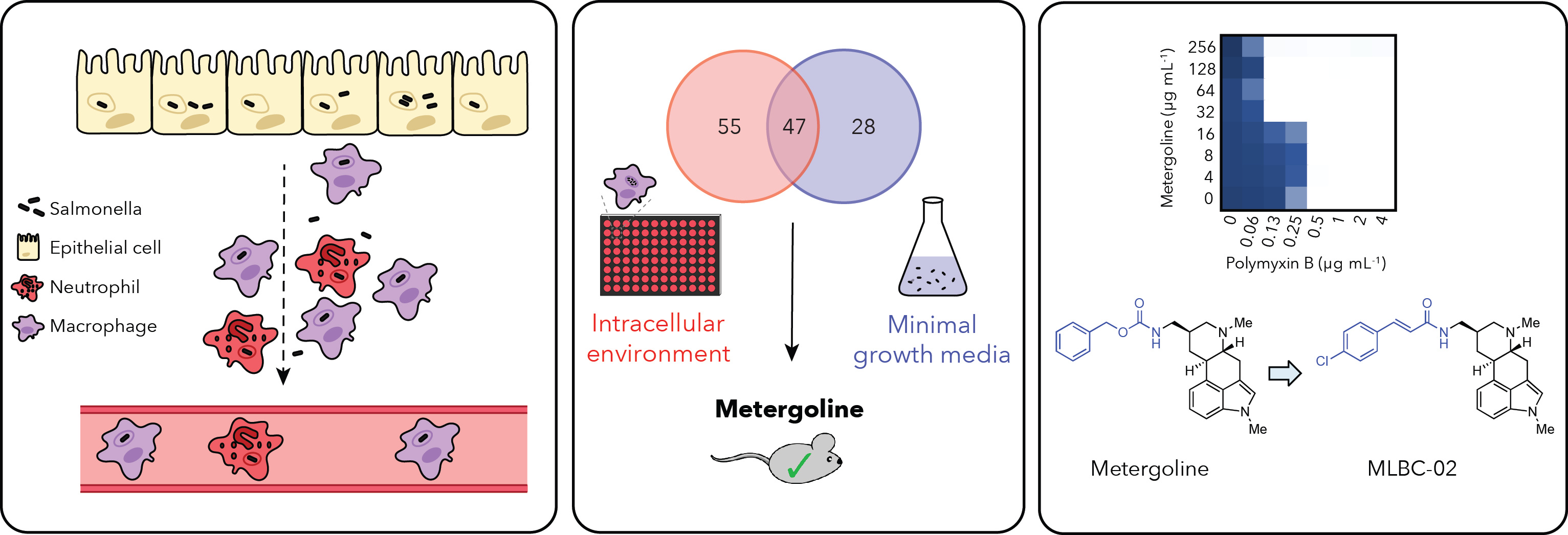 We initially encountered some difficulty in reconciling the discrepancy between compound activity against Salmonella grown in either macrophages or LPM, despite the intracellular-mimicking nature of the latter. However, Mike considered the potential impact of antimicrobial peptides present within host cells, and therefore did a chequerboard assay with an antimicrobial peptide (polymyxin B) and one of our most promising leads (metergoline). Excitingly, the addition of this membrane-perturbing agent allowed us to observe antibacterial activity against Salmonella grown even in nutrient-rich microbiological media (MHB). By January 2018, Caressa had shown that metergoline worked in vivo to extend animal survival during a lethal Salmonella infection, and Mike had found that chemical or genetic perturbation of the outer membrane was sufficient for metergoline to work in MHB.