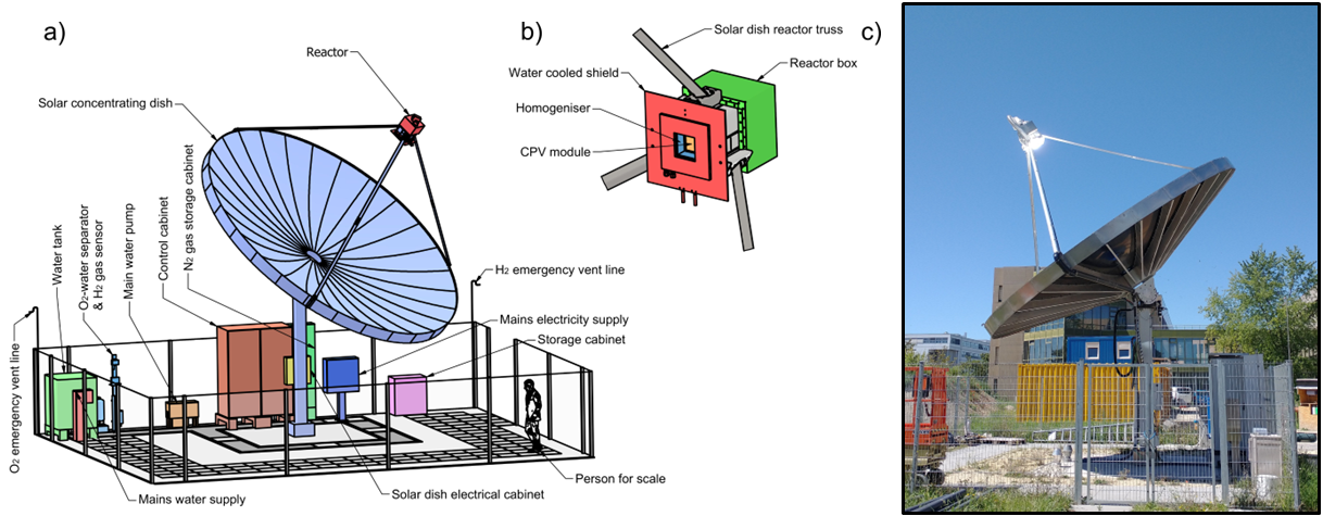A demonstration plant was built on EPFL campus and includes a 7 m-diameter solar parabolic dish, an integrated photo-electrochemical reactor placed in the focal point of the dish and various auxiliary components such as pumps and heat exchangers. An annotated overview of the pilot plant and photographs of the system during operation is shown in Figure 1. A number of engineering challenges were overcome in order to realise this innovative design which included careful process design and control strategies to ensure the safe operation during start up, operation and shut down.