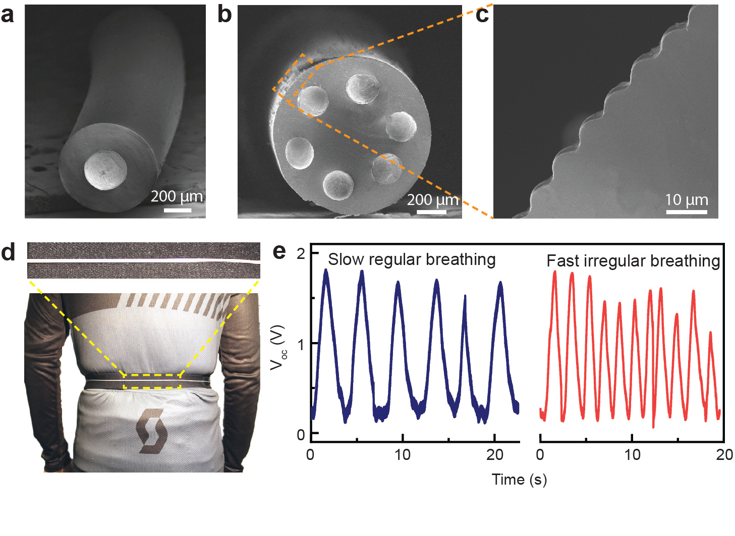 Fiber structures and breathing monitoring applications. a A super-elastic fiber with a single liquid metal electrode. b-c A fiber features six embedded electrodes and a microtextured surface. d The microtextured fiber is fixed on a stretchable belt, which is worn around the torso. e The generated waveforms allow the quantitative assessment of breathing patterns.